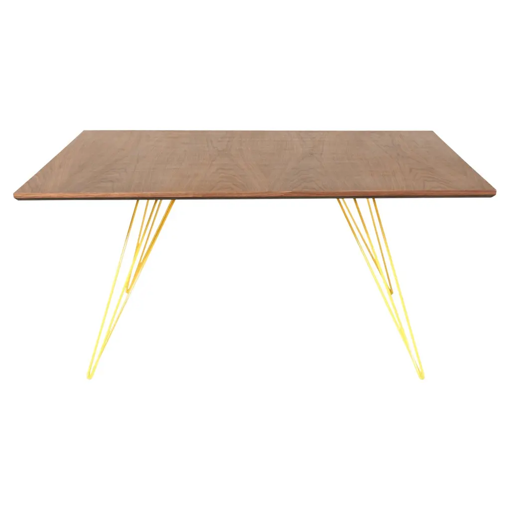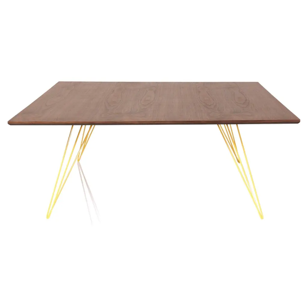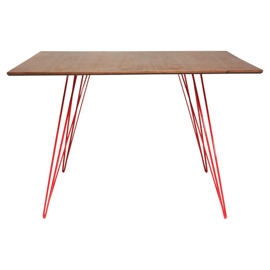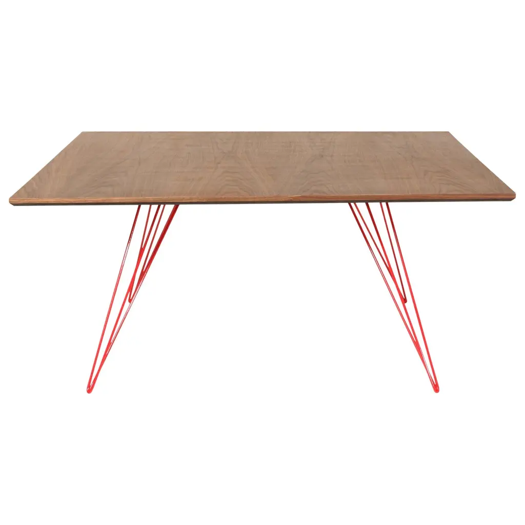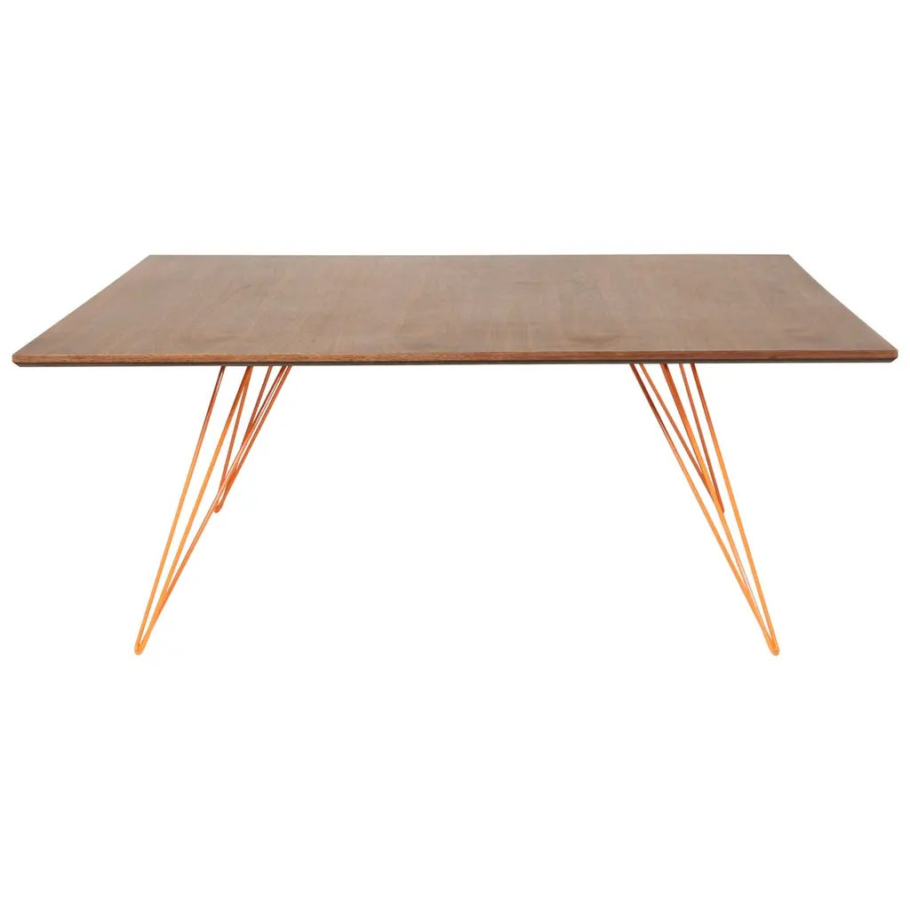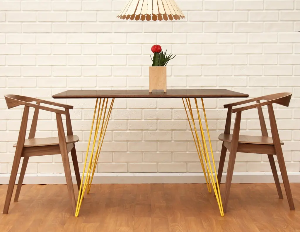 A thin, elegant and light table that can be customized to any shape, size and color desired. This handcrafted item perfectly blends industrial hairpin legs with a beveled wooden top. The irregular beauty of its natural wood combined with its simple elegant base creates a timeless, original design. This piece is offered in dinning and coffee heights as well as several shapes and sizes including large and small: rectangle, oval, square, and circle.