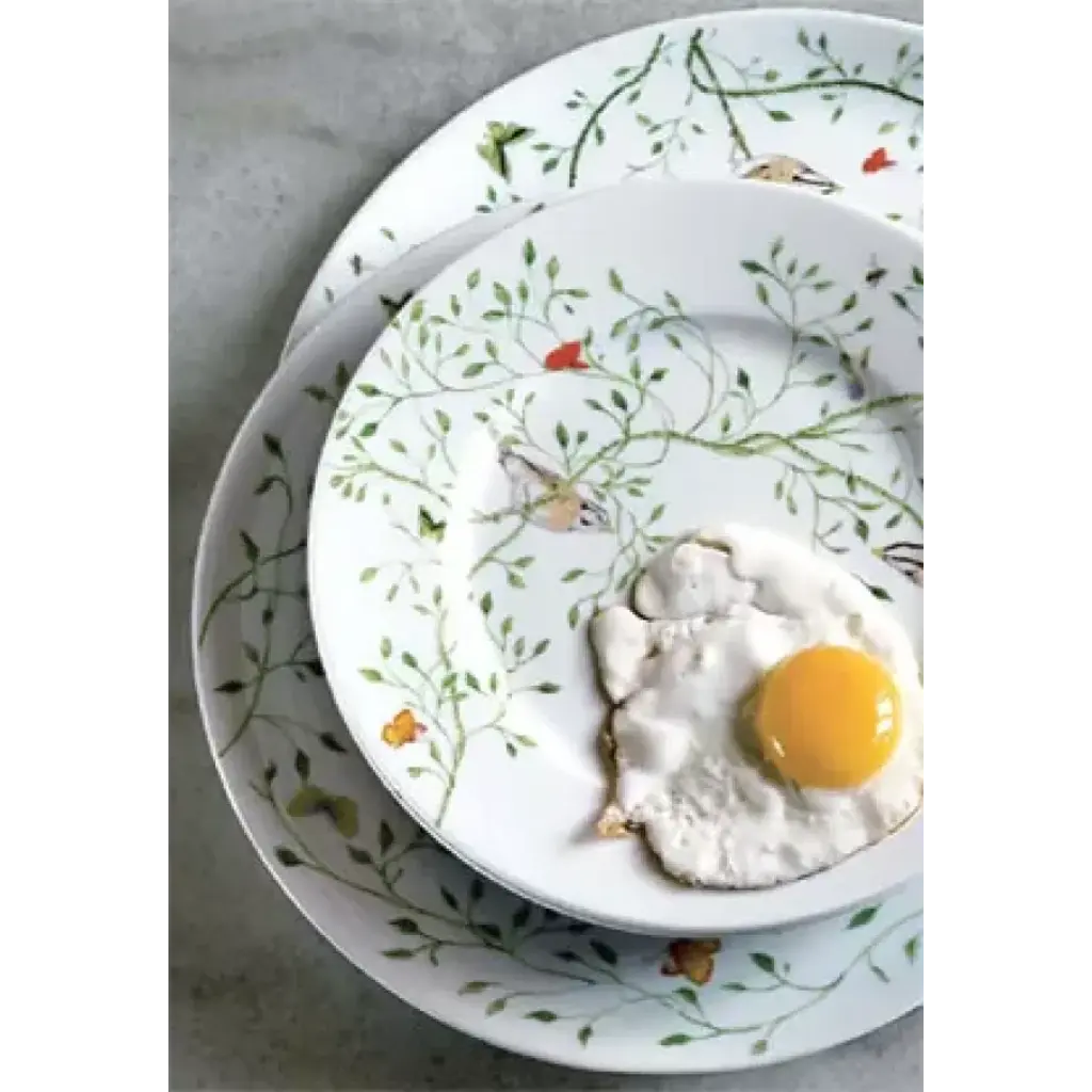 Birds and butterflies adorn Raynaud's Wing Song dinnerware, also known as Histoire Naturel. Designed by Pamela Baldwin, a portion of the proceeds goes to the Jane Goodall Institute to help preserve endangered species. Five-piece place setting includes dinner plate, salad plate, bread/butter plate, teacup, and saucer. Raynaud was established in 1849 and is the only survivor of 11 porcelain factories existing in Limoges, France. After years of research, Raynaud discovered techniques to create infinite combinations of fade-resistant decorations that is still used by porcelain makers. Boasting a client list of numerous presidents to Princess Diana, Raynaud has been the synonym of quality, known and recognized on every continent.