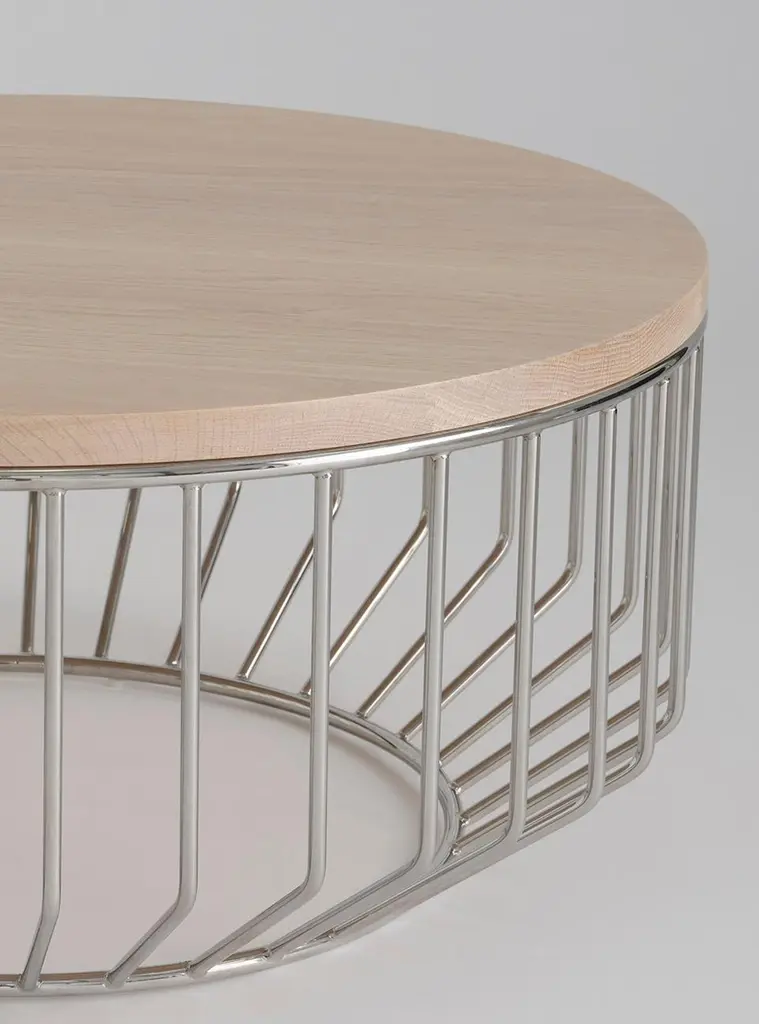 Wired Coffee Table by Phase DesignDimensions: Ø 81.3 x H 35.6 cm. Materials: Polished chrome and white oak.Solid steel bar with glass, upholstered, or solid wooden tops, available in walnut, white oak, or ebonized oak. Steel available in gloss or flat white and black powder coat, polished chrome, burnt copper or smoked brass finishes. Powder coat finishes also available in custom colors. Prices may vary. Please contact us.Blending sloping angles and taut lengths of bent metal are a modern interpretation of the wiry idea initially conceived by Warren Platner. The series is made up of a suite of tables, side tables and benches and fitted with luxurious solid wood, glass, or upholstered tops.Autodidact award-winning designer Reza Feiz has always been drawn to the strength in simplicity. Lured to Southern California by its inventive, creative spirit, he quickly discovered his true calling among the vast community of creators and artisans whose skills and ingenuity expertly transform imagination into reality.Inspired by Los Angeles’ iconic landscape and the compelling beauty of the places and spaces he encountered, he envisioned furniture, lighting and tabletop accessories, fabricating them from contemporary materials with the help of a tightly knit coterie of craftspeople.The resulting restrained yet revolutionary pieces have garnered enthusiasm from an international audience.He’s been lauded as “An American designer who influences world design”, a “Style Pioneer” and “One of a group of select young designers who represent the leading edge of discovery in design.” Architectural Digest’s Mayer Rus noted that his “wide-ranging collections make a strong case for the enduring appeal of restrained modern design.” Surface Magazine raved that he “imbues his work with a 21st-century edge. His astute sense of restraint keeps the designs relevant in a constantly evolving industry, without needing to subscribe to trends.”“Reza Feiz imbues his work with a 21st-century edge. His astute sense of restraint keeps the designs relevant in a constantly evolving industry, without needing to subscribe to trends.”