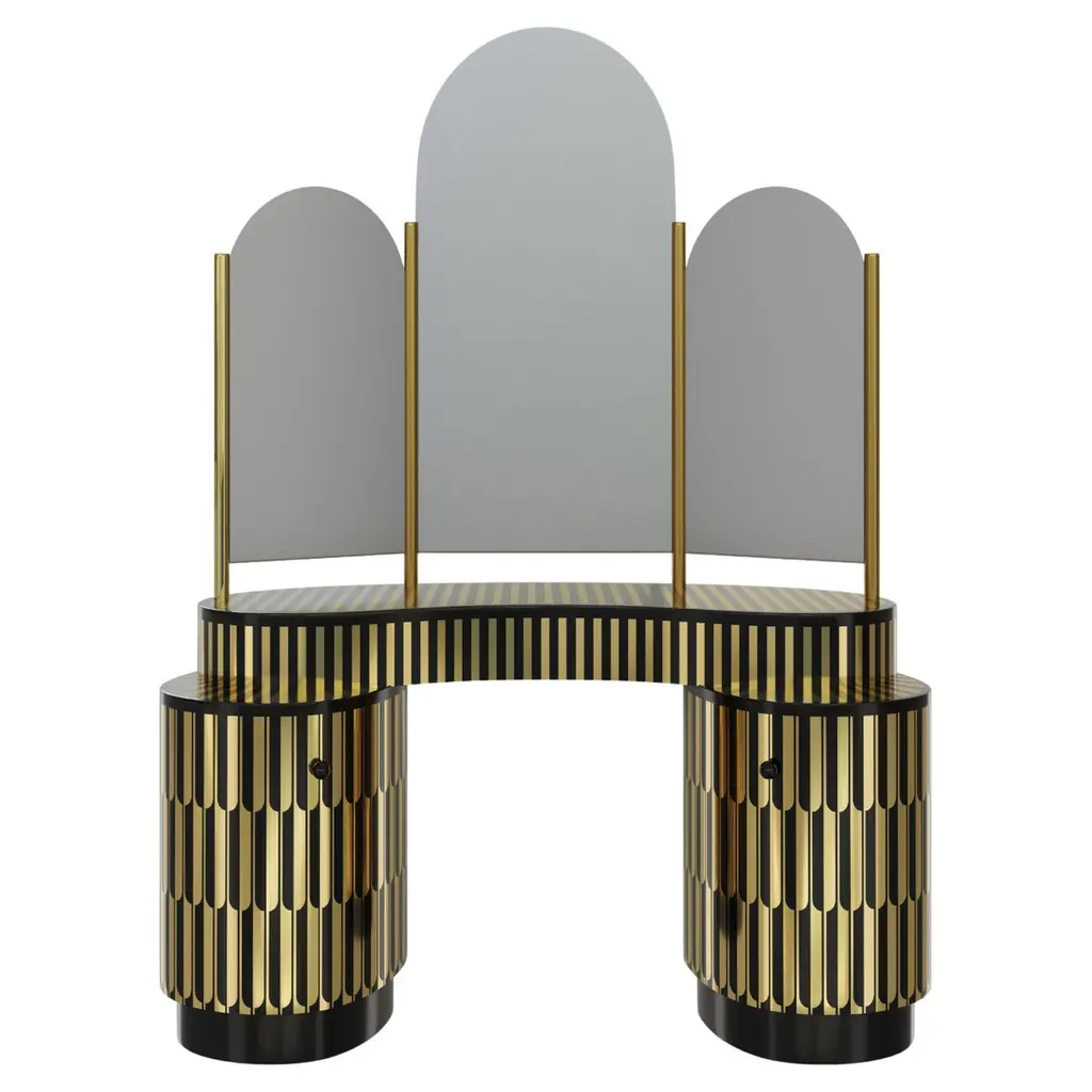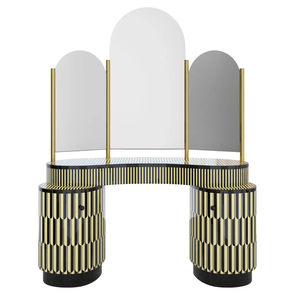 Woman in Paris Vanity Table in Brass by Matteo Cibic is an opulent vanity table with brass inlay. It has two drawers and three mirrors, two of which can be moved to desired angles. Matteo Cibic designed the Vanilla Noir collection for Scarlet Splendour in 2014-15. The collection over the years comprises of over fifty beautiful pieces of furniture finished in resin inlay work painstakingly handcrafted in India. The forms of these pieces are delightfully unique – some are reminiscent of Art Deco style and some are playful with quirky shapes. But always soft edged and charming. The founders of Scarlet Splendour couldn't have enough of this chic Italian line develop by Cibic. So after much deliberation amongst them, it was decided that this collection should be produced in a more opulent and precious material — brass was the obvious choice. Marquetry has long been a Craft in India, be it of metal, semi-precious stones, bone, ivory or wood. Brass inlay work is a popular handicraft right from Rajasthan and Uttar Pradesh in the north to Tamil Nadu in the south. This Craft is used in the Vanilla Noir Oro collection as brass is meticulously crafted on wood to create strong graphic patterns. Paradoxically, the patterns remain subtle as well because there is no contrasting color or material used in the inlay. The result has been an elegant, decadent collection, a fine contemporary take on a traditional Craft.Care: Wipe gently with dry soft cloth. Liquid spillage must be wiped without delay.Please note: Each piece in the Vanilla Noir Oro collection exalts the handmade, the painstakingly crafted, the authentic. A piece may have slight variations and tiny imperfections but these are the marks of an artisan, a testament to the individuality of each work of art. It is our belief that these variations infuse our objects d'art which desire and we assert our right to make the necessary qualitative changes. Prices do not include VAT. VAT may be applied depending on the ship-to location.