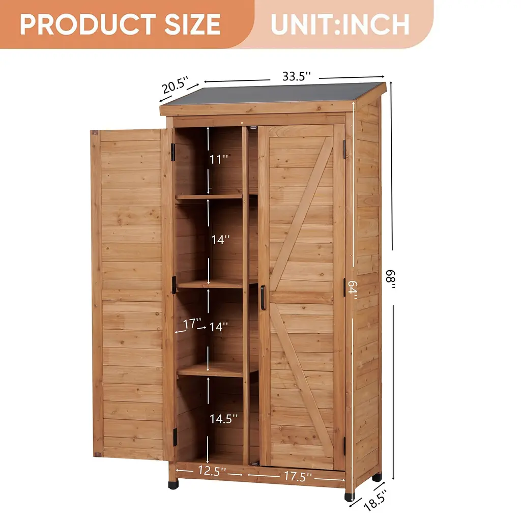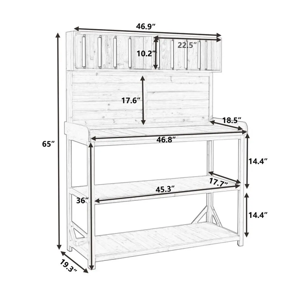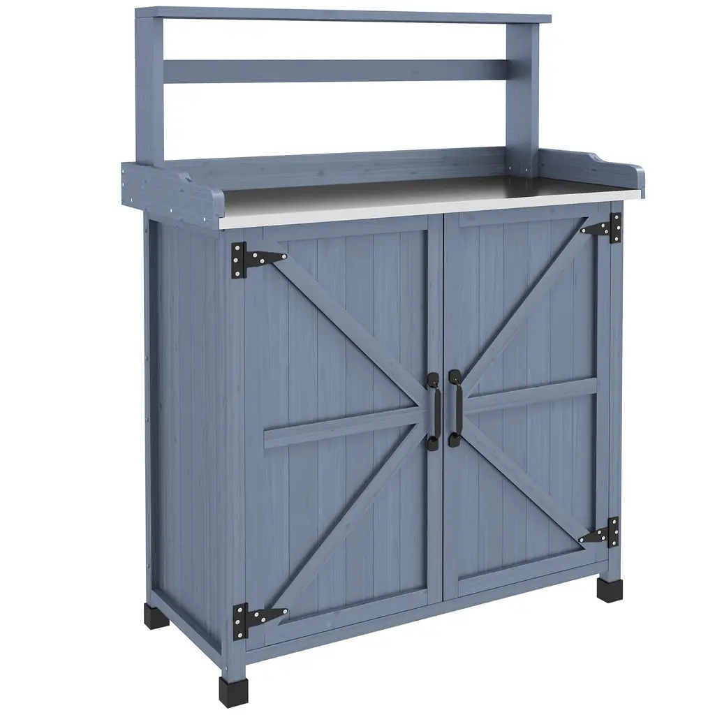 Product Name:Outsunny Potting Bench, Outdoor Wooden Potting Table with Storage Cabinet with 2 Shelves, Garden Work Bench with Galvanized Plated Tabletop for Backyard, BalconyMain Material:WoodProduct DimensionsAssembled Length (in.):35.75Assembled Width (in.):16.25Assembled Height (in.):49.00Weight (lbs.):35.53Package SizeLength (in.):38.50Width (in.):11.75Height (in.):18.50Weight (lbs.):40.48Product FeaturesPotting Bench with Storage: Gardening work can be a lot easier when you have a workstation with supplies nearby. This outdoor potting bench with storage has a large, flat metal surface. It includes a tool hanging area and a two-door cabinet with two tiers of shelves inside.Country Farmhouse Potting Bench: Featuring a classic farmhouse "x" motif along the two doors, our outdoor potting bench isn't just practicalit's practically a centerpiece for any patio, lawn, yard, or garden.Outdoor Potting Table: This water and weather-safe potting table is built to endure outdoor conditions. Paint-sealed fir wood and a galvanized steel surface make this a potting station that's outside and ready.Stability: Anti-slip rubber foot covers protect our potting bench from moisture on the ground, protect floors from scratching, and stop your workstation from shaking as you use it.Potting Bench with Storage Info: Size: 35.75" W x 16.25" D x 49" H. Worktable surface: 33.75" W x 15.25" D x 33.25" H. Maximum Load: 165 lbs. (Tabletop), 11 lbs. (Shelf), 33 lbs. (Cabinet Shelf). Assembly required.