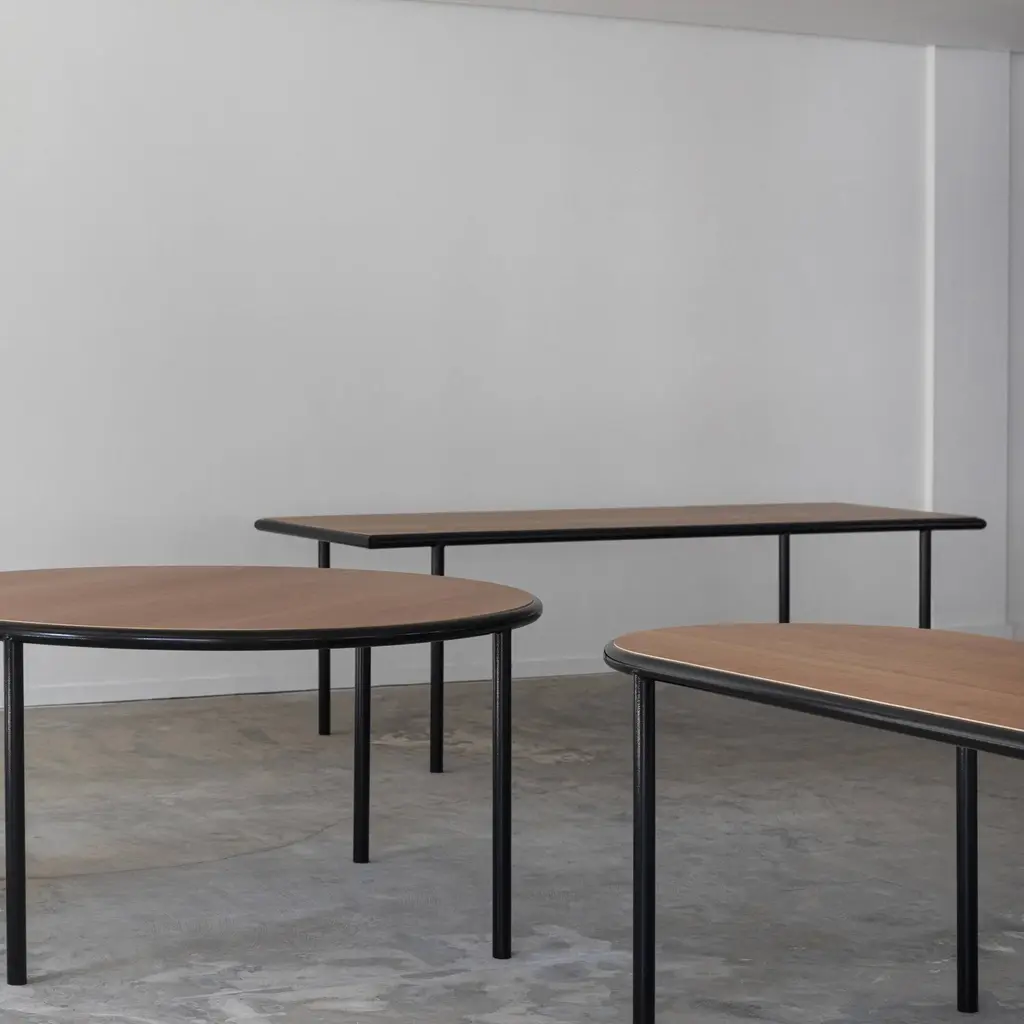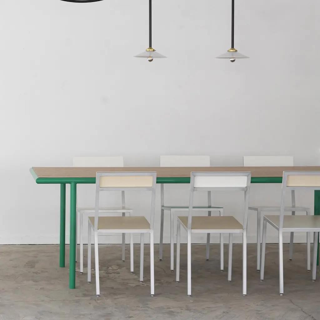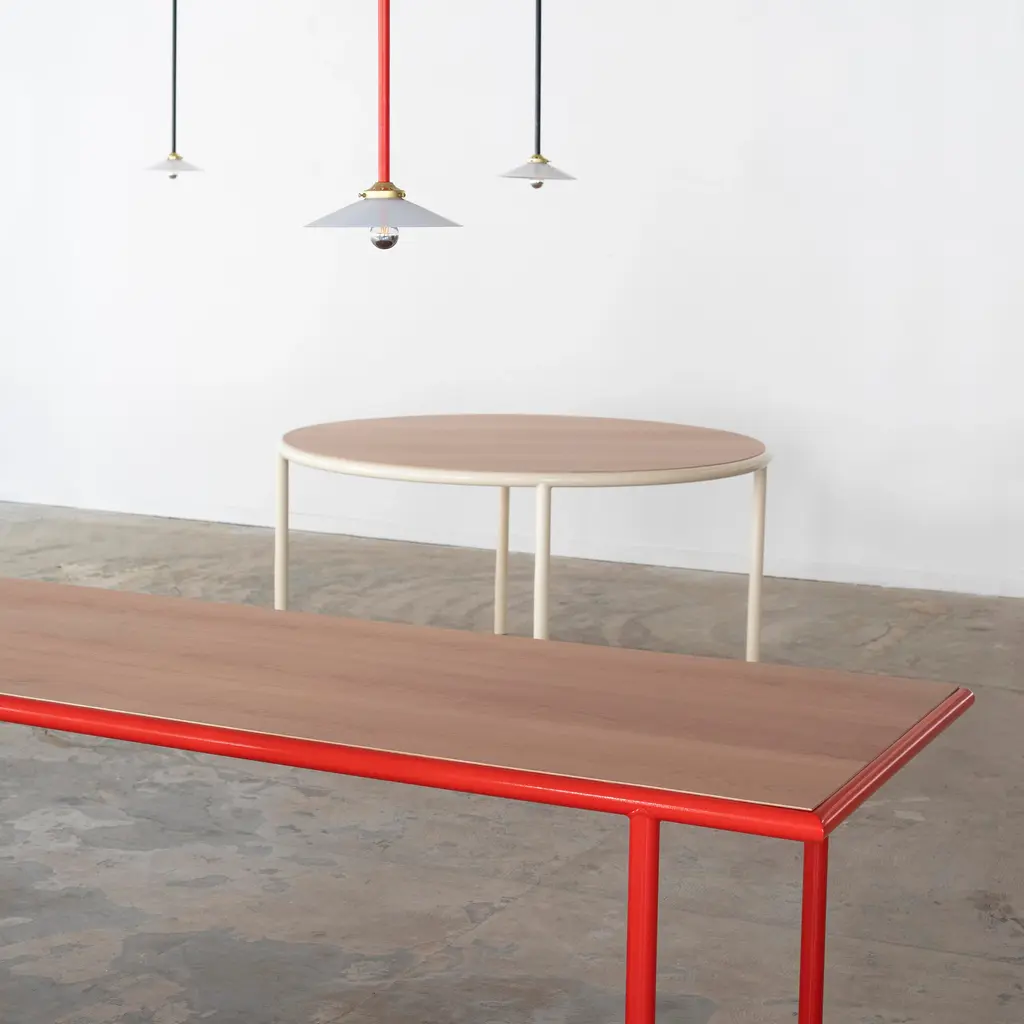 From Valerie Objects' Wooden Table series, a long rectangular version is just the thing for dinners with a big group or to use as an expansive desktop. Design duo Muller Van Severen add visual appeal with a frame and legs fashioned in rounded steel tubing, powder-coated in a range of glossy hues. Combined with the 4 different options for the timber tabletop—light birch, classic oak, rich walnut and a darker cherry—there are numerous possibilities to create the perfect look.