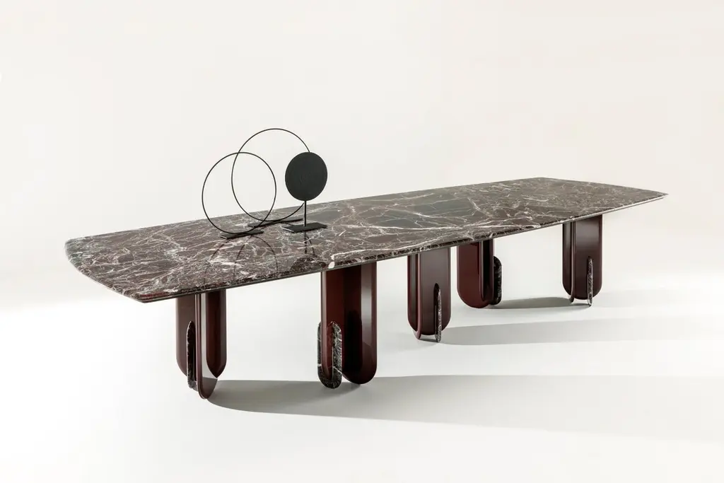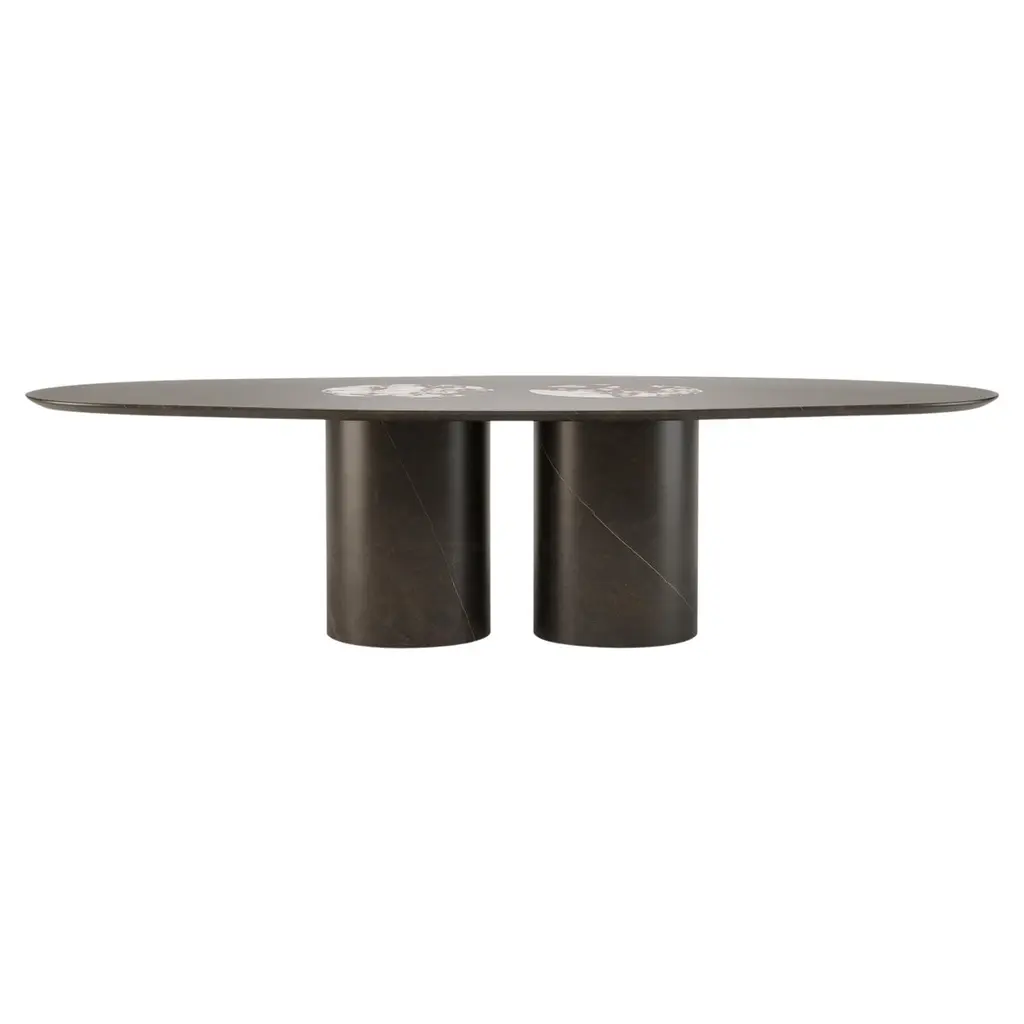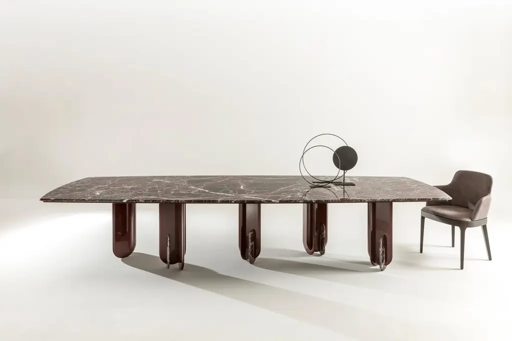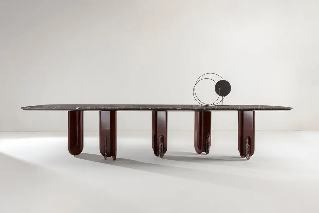 Wooden Top and Modular Legs Talento Rectangular Table by LaurameroniDimensions: W 300 x D 120 x H 75 cmMaterials: Top Finish: Plain Wood Essence.Legs finish: polyester glossy lacquered, Emperador Brown marble, plain wood essence, Bronze Delabré lacquering.TAL 40 B2: Round or rectangular table available in different sizes, with wooden top and modular legs with a rounded section. Available with integrated Lazy Susan. Customizable with wooden or marble top, and with wooden, marble or special Bronze Delabré finish legs.Laurameroni:The ability of craftsmen from the Brianza area has fascinated them from a young age. Over time, this craftsmanship has evolved and developed into industrial production. They wanted to invite architects to rediscover and exploit the unique skills of master craftsmen. Their aim was to create products using the most sophisticated equipment and the finest materials, designed for ambitious and refined individuals seeking items where differentiation and uniqueness prevail.