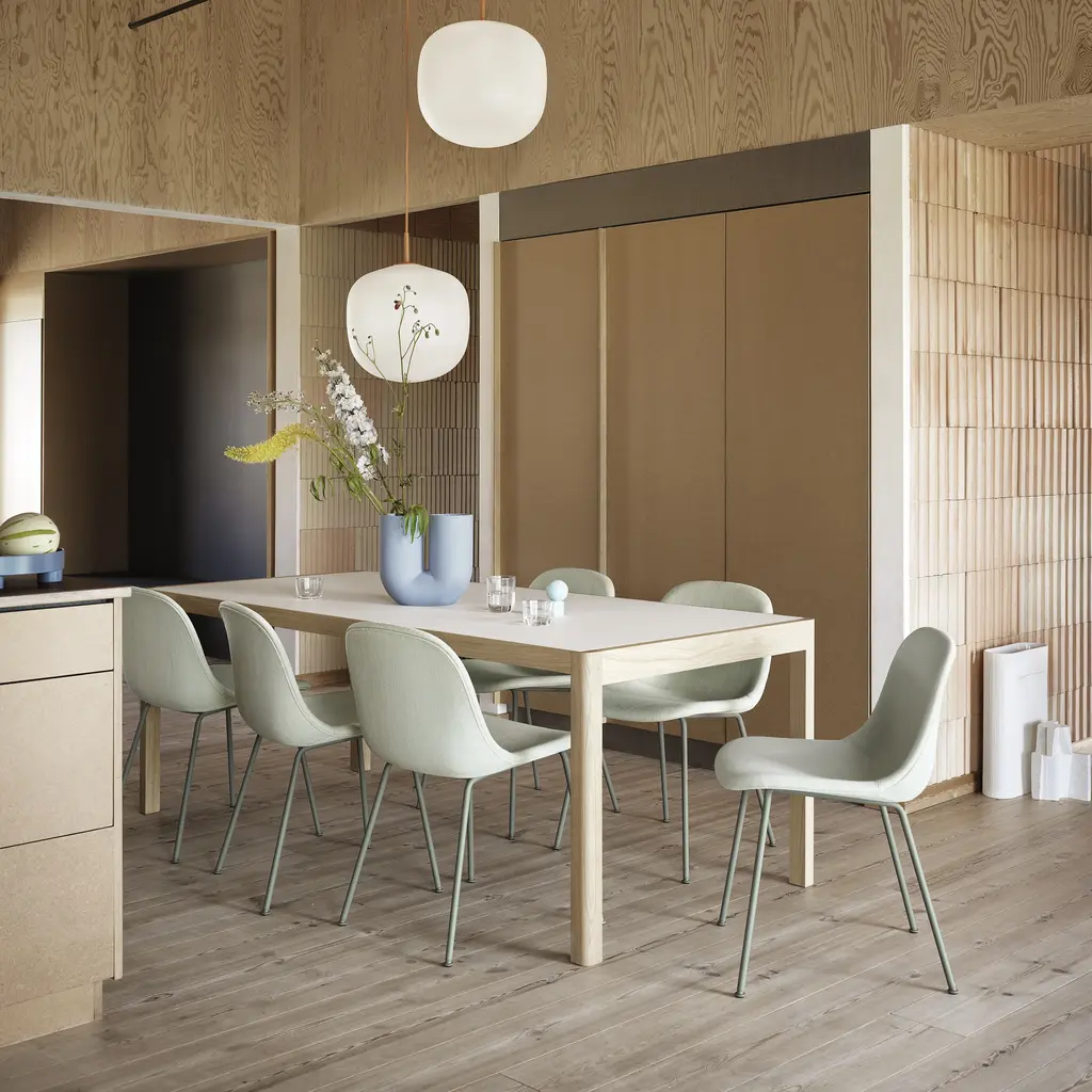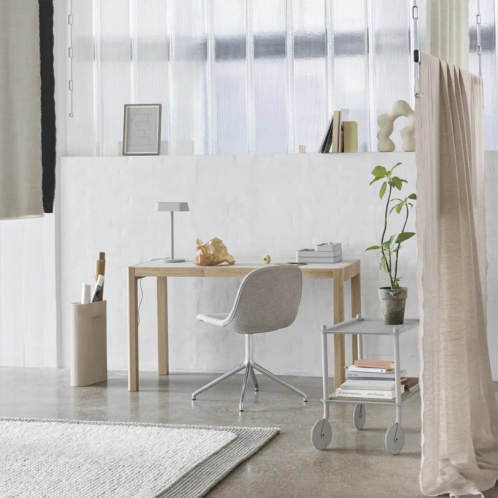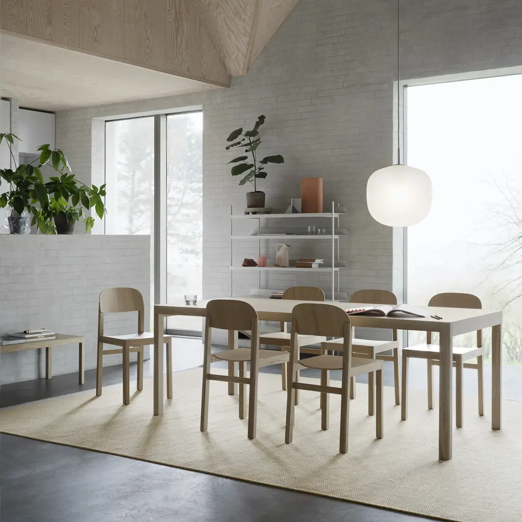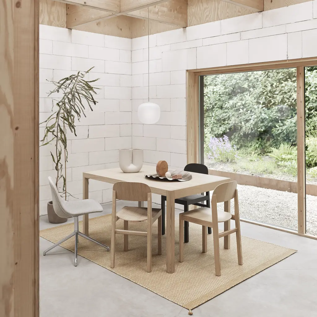 “Workshop Table is a design that is pared down to the essence,” says its creator Cecilie Manz, “allowing for the details and joints to do all the talking.” With renowned Scandinavian craftsmanship, the tabletop is inlaid in the solid-oak frame with its visibly coupled rounded legs. The table’s legs and frame are finished with a water-based lacquer with the tabletop in either matching oak veneer or a warm gray linoleum.