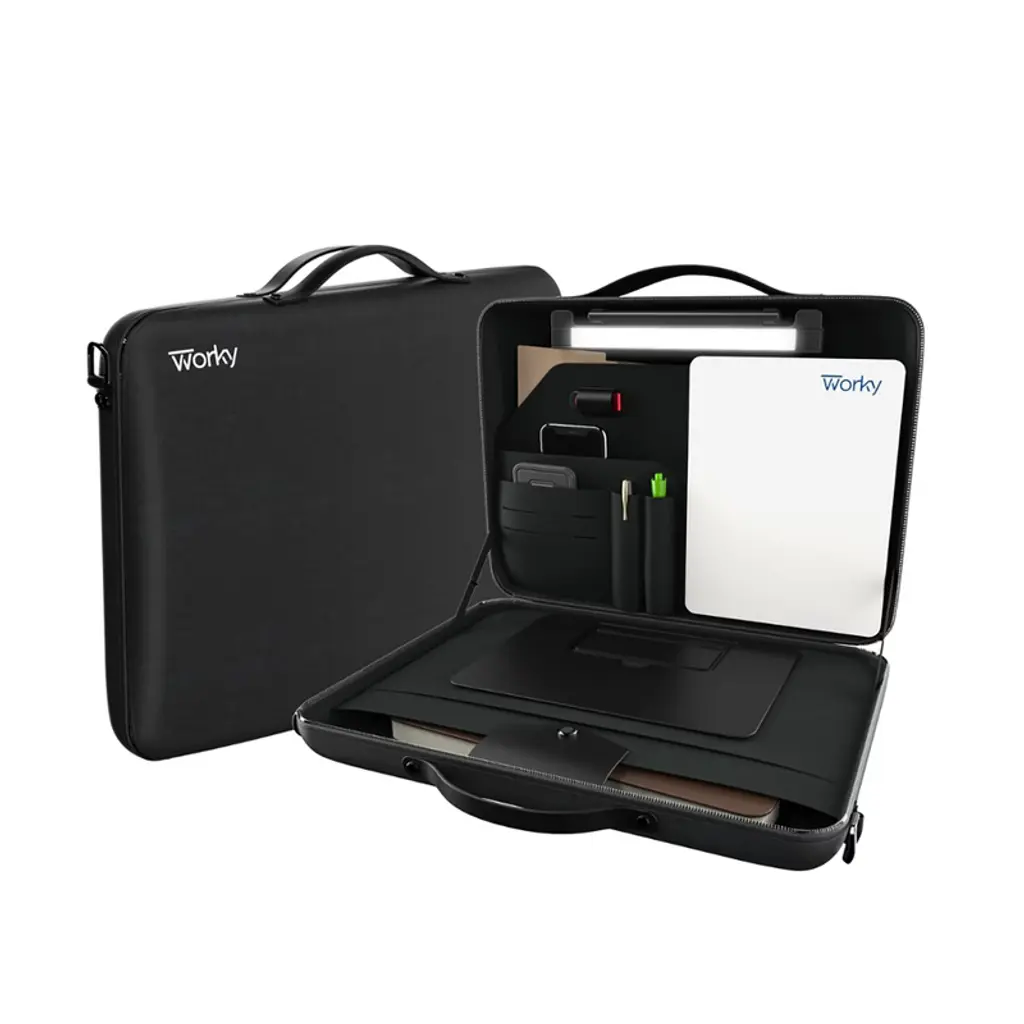 Worky™ Office Everywhere Portable Briefcase Workstation, Black | The Office Everywhere Portable Briefcase Workstation in black is the ultimate solution for professionals who need a flexible and mobile workspace. This versatile briefcase allows you to transform any location into a functional office—whether at home, in a cafe, or on the go. Designed for efficiency and organization, it features a detachable USB-powered LED video conference light to enhance your presence during video calls, offering adjustable brightness for optimal lighting. The innovative whiteboard not only serves as a surface for brainstorming but also swivels to reveal hidden storage compartments, improving organization. With dedicated sections for laptops, cables, and documents, you’ll have everything neatly in place. Additionally, the built-in tablet and foldable phone stands ensure hands-free convenience, making it easy to access your devices while working. The Office Everywhere Workstation is a must-have for anyone who needs to stay productive on the move.