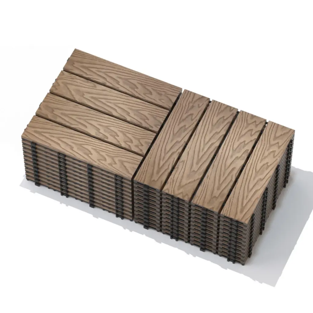 DESCRIPTIONIf you have a soft spot for wooden floors but are concerned about their fragility, then wood plastic composite (WPC) floor tiles are the ideal choice for you. Traditional full wooden floors are prone to serious damage after long-term exposure to harsh weather, but there is no such concern for WPC floor tiles. Made from a combination of wood and plastic, WPC floor tiles retain the natural beauty of wood while providing additional durability. They are easy to install, easy to clean, and have excellent weather resistance, making them ideal for indoor and outdoor use, even in wet areas. In addition, the thick and sturdy structure of WPC floor tiles ensures excellent load-bearing capacity, while being affordable, making it your ideal flooring solution.Product Features【Durability and Weather Resistance】- WPC floor tiles combine wood and plastic, which, unlike traditional wood flooring, provide superior durability and excellent resistance to harsh weather. 【Natural Aesthetic】- Retains the natural beauty of wood, providing a warm and inviting look to any space. 【Easy Installation and Maintenance】- Simple to install and easy to clean, saving you time and effort in both setup and upkeep. 【Versatile Use】- Perfect for both indoor and outdoor environments, including wet areas, without compromising on performance. 【Strong Load-Bearing Capacity】- The thick and sturdy construction ensures excellent weight support, while remaining an affordable flooring option.Product InformationPlace of Origin:ChinaMain Material:PlasticProduct DimensionsAssembled Length (in.):11.80Assembled Width (in.):11.80Assembled Height (in.):0.86