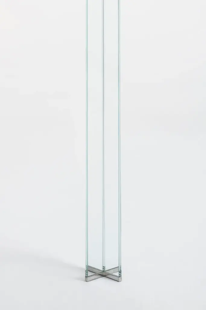 High table with square, round, oval or rectangular shape with top in 15 mm thick transparent extralight or smoked glass or in laminated 8+8 mm “blue paste glass”.The legs, in 10 mm thick extralight, smoked or blue paste tempered glass, UV-bonded, are removable and fixed to the top by means of sophisticated plates in mirror-polished stainless steel. The table is refined at the bottom by four feet in mirror-polished stainless steel, perfectly integrated into the shape of the legs.