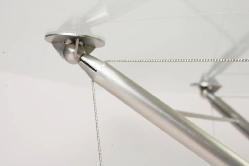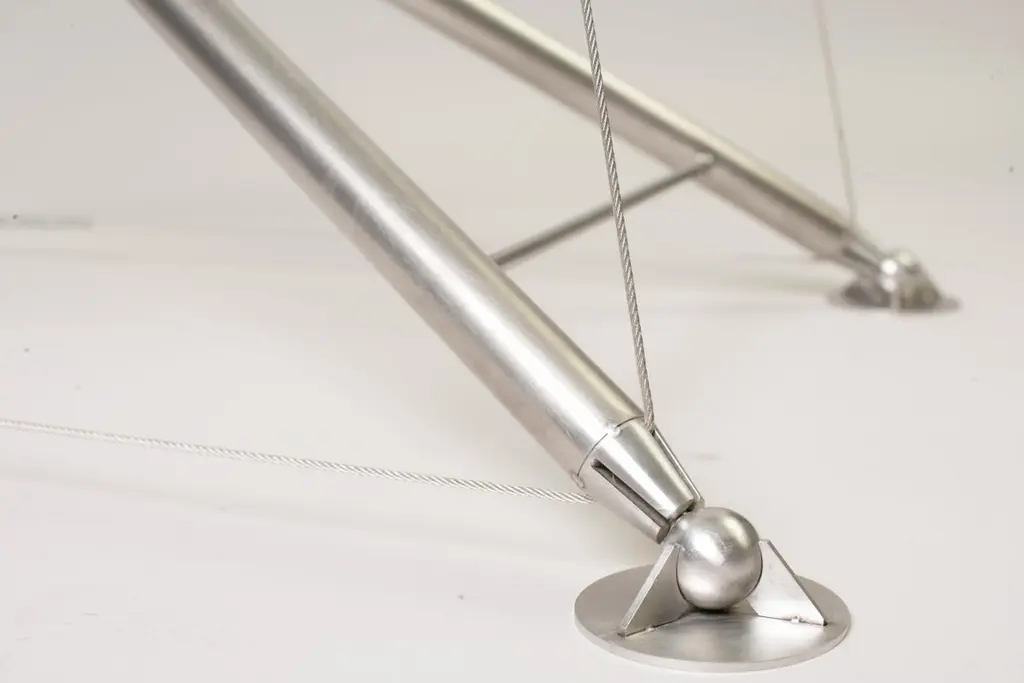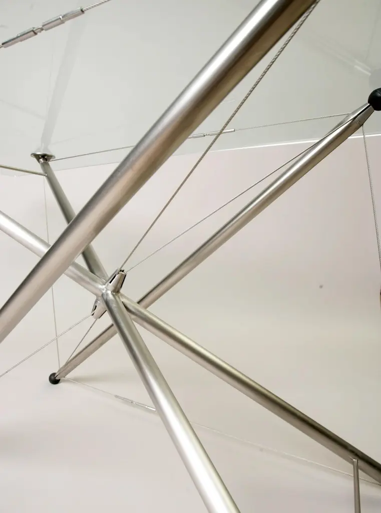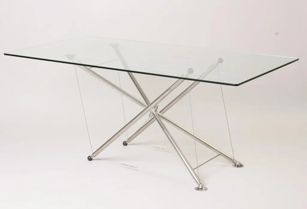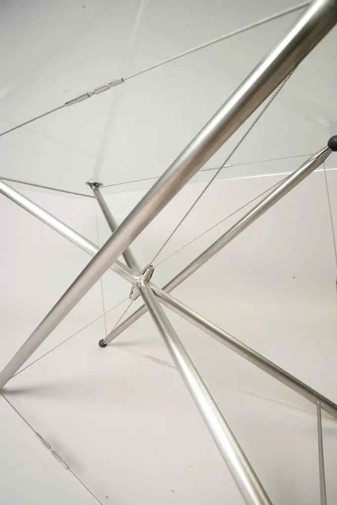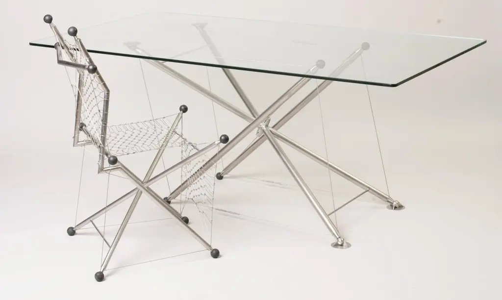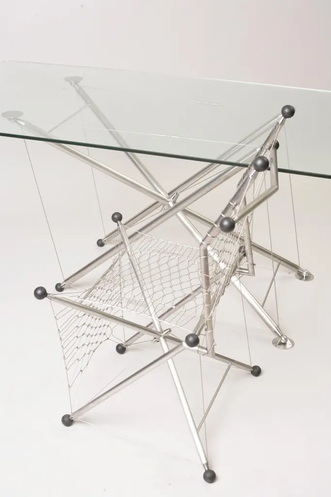 X-Tense Table by Konstantin Achkov StudioLimited Edition Of 1 PieceDimensions: Glass top: D 90 x W 180 cm.Base: D 55 x W 110 x H 74 cm.Materials: Resin, glass, and stainless steel.The X-tense table is a real tensegrity structure, which with its minimalismof only three elements, visually making the table seem impossible.Konstantin Achkov is a leading Bulgarian sculptor. He has been developing the idea of applicability of tensegrity structures in furniture and especially in chairs for nearly twenty years. With two scientific papers in progress and international recognition for his contribution to the subject by its discoverer Kenneth Snelson and other leading scientists inthe field, it can be said that tensegrity is one of the greatest themes of his life!With explicit originality in his designs not only at the structural level but also in the overall form, the tensegrity structures created by the author surprise the viewer with the scene of solid elements supported in space by a complex geometric network of tense ropes. A sense of impossible levitating elements is created! A clear view of loaded and stressedparts by pre-stressing the structure. Another characteristic of these structures is the intelligent spring system that always returns to its original shape. This allows the chairs to be flexible by responding ergonomically at the backrest or the base to the weight of the user. In this way, they become active systems moving parallel to the person sitting on them. On the other hand, the complexity of conceiving and building tensegrity has given impetus to categorize them as minimalist sculptures with levitating elements from the very beginning.