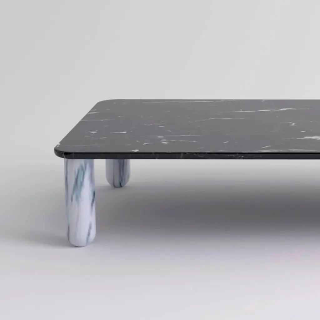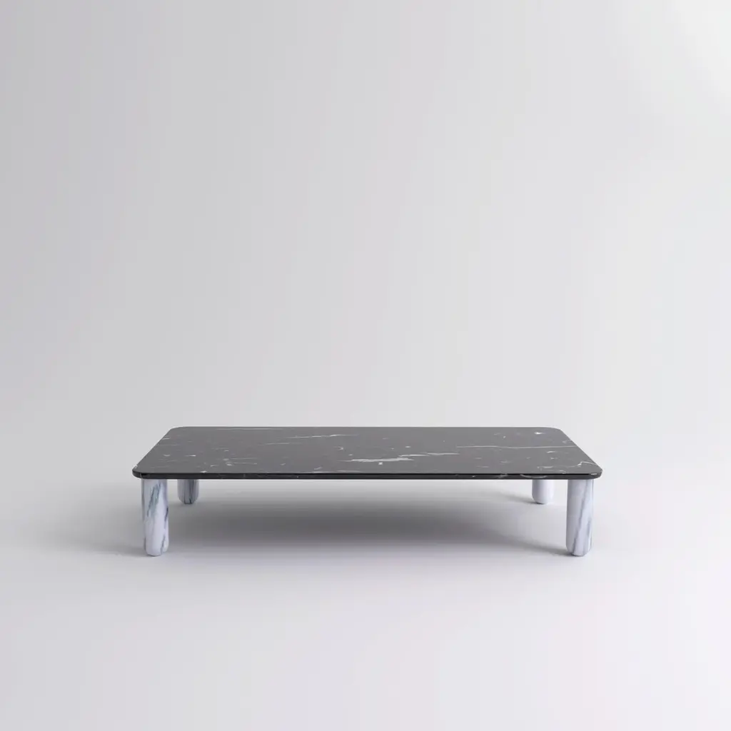 XLarge black and white marble "Sunday" coffee table, Jean-Baptiste SouletieDimensions: 100 W x 200 D x 35 H cm.Materials: Pele de Tigre marble legs, Black Marquina marble top.Available in 4 sizes: D150, W50 / D200, W50 / D150, W100 / D200, W100.Available in 5 top materials: walnut / black stained wood / Pele de Tigre marble / Black Marquina marble / Indian green marble.Available in 3 leg materials: Pele de Tigre marble / Black Marquina marble / Indian green marble.Sunday is a family of coffee tables and low consoles with a simple and clean design vocabulary. The combination of heavy marble legs with the thin solid wood or marble top creates an interesting contrast while the rounded edges and generous proportions provide a comforting feeling.Jean-Baptiste Souletie is the Co-founder of the furniture editor La Chance with Louise Breguet. He studied in India, worked for a merchant bank in London (where he designed their new offices), before working for an investment fund (where he redevised the graphic chart), and in the strategic department of a luxury goods company in Paris. He returned to his first loves, architecture and furniture, when he founded La Chance in 2012.