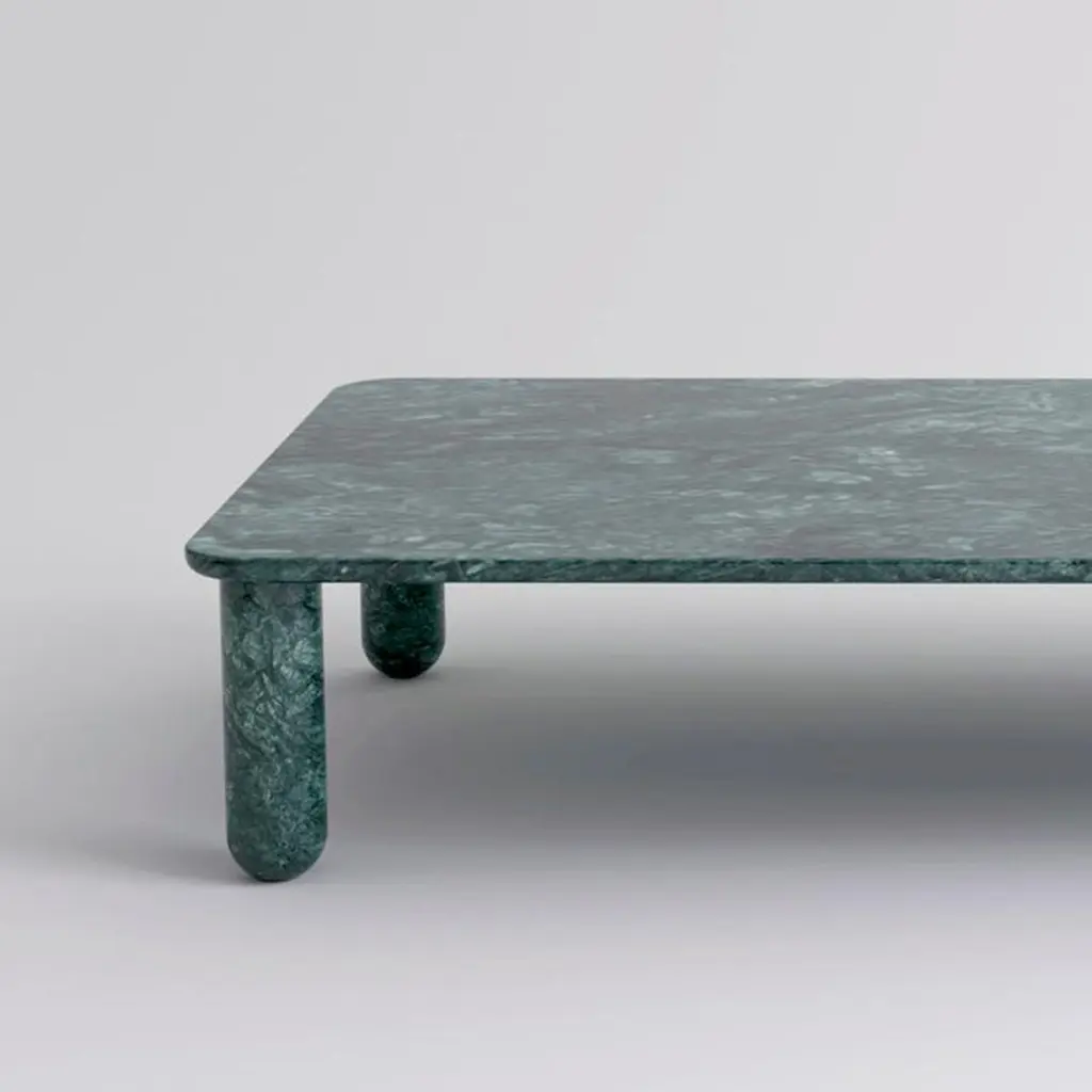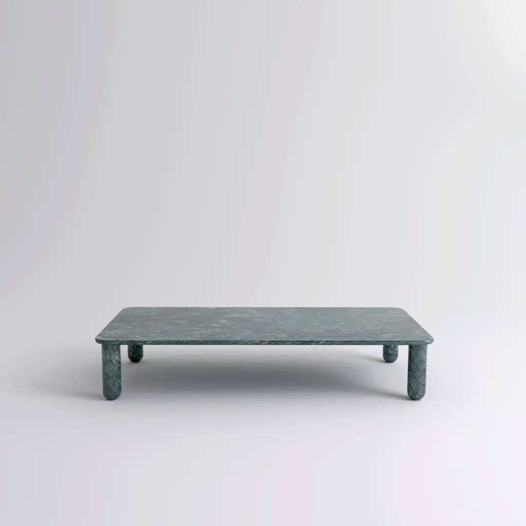 XLarge green marble "Sunday" coffee table, Jean-Baptiste SouletieDimensions: 100 W x 200 D x 35 H cmMaterials: Indian Green marble.Available in 4 sizes: D150, W50 / D200, W50 / D150, W100 / D200, W100.Available in 5 top materials: walnut / black stained wood / Pele de Tigre marble / Black Marquina marble / Indian green marble.Available in 3 leg materials: Pele de Tigre marble / Black Marquina marble / Indian green marble.Sunday is a family of coffee tables and low consoles with a simple and clean design vocabulary. The combination of heavy marble legs with the thin solid wood or marble top creates an interesting contrast while the rounded edges and generous proportions provide a comforting feeling.Jean-Baptiste Souletie is the Co-founder of the furniture editor La Chance with Louise Breguet. He studied in India, worked for a merchant bank in London (where he designed their new offices), before working for an investment fund (where he redevised the graphic chart), and in the strategic department of a luxury goods company in Paris. He returned to his first loves, architecture and furniture, when he founded La Chance in 2012.