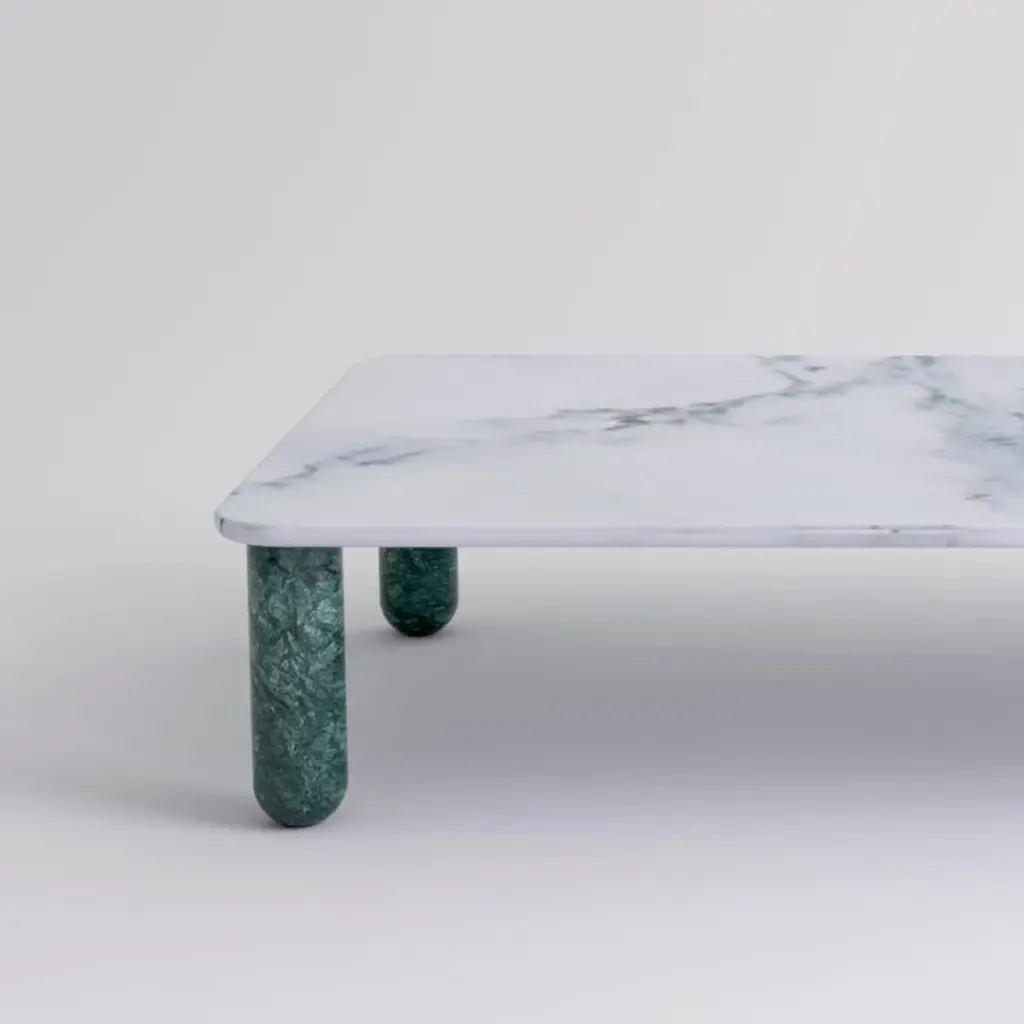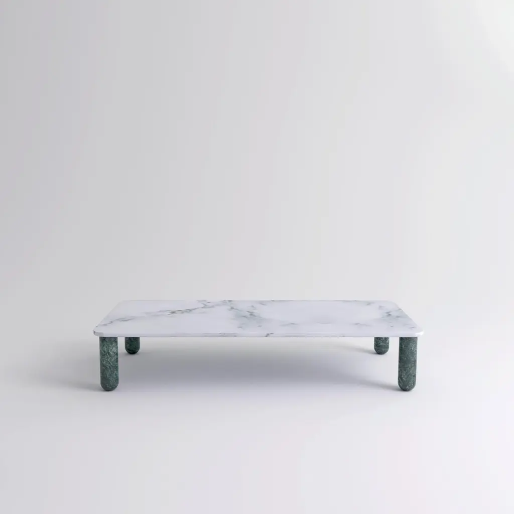 XLarge white and green marble "Sunday" coffee table, Jean-Baptiste SouletieDimensions: 100 W x 200 D x 35 H cmMaterials: Indian Green marble legs, Pele de Tigre marble top.Available in 4 sizes: D150, W50 / D200, W50 / D150, W100 / D200, W100.Available in 5 top materials: walnut / black stained wood / Pele de Tigre marble / Black Marquina marble / Indian green marble.Available in 3 leg materials: Pele de Tigre marble / Black Marquina marble / Indian green marble.Sunday is a family of coffee tables and low consoles with a simple and clean design vocabulary. The combination of heavy marble legs with the thin solid wood or marble top creates an interesting contrast while the rounded edges and generous proportions provide a comforting feeling.Jean-Baptiste Souletie is the Co-founder of the furniture editor La Chance with Louise Breguet. He studied in India, worked for a merchant bank in London (where he designed their new offices), before working for an investment fund (where he redevised the graphic chart), and in the strategic department of a luxury goods company in Paris. He returned to his first loves, architecture and furniture, when he founded La Chance in 2012.