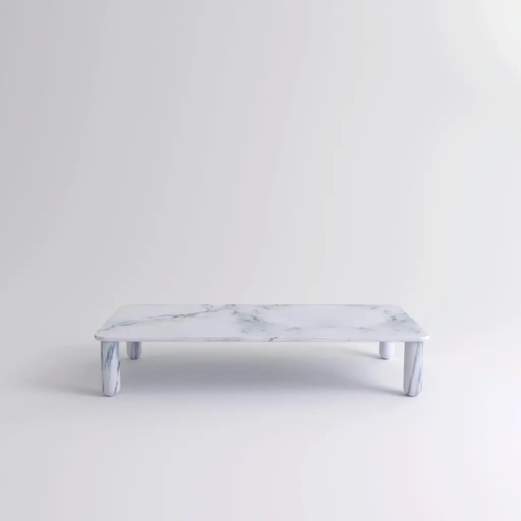 XLarge white marble "Sunday" coffee table, Jean-Baptiste SouletieDimensions: 100 W x 200 D x 35 H cmMaterials: Pele de Tigre marble.Available in 4 sizes: D150, W50 / D200, W50 / D150, W100 / D200, W100.Available in 5 top materials: walnut / black stained wood / Pele de Tigre marble / Black Marquina marble / Indian green marble.Available in 3 leg materials: Pele de Tigre marble / Black Marquina marble / Indian green marble.Sunday is a family of coffee tables and low consoles with a simple and clean design vocabulary. The combination of heavy marble legs with the thin solid wood or marble top creates an interesting contrast while the rounded edges and generous proportions provide a comforting feeling.Jean-Baptiste Souletie is the Co-founder of the furniture editor La Chance with Louise Breguet. He studied in India, worked for a merchant bank in London (where he designed their new offices), before working for an investment fund (where he redevised the graphic chart), and in the strategic department of a luxury goods company in Paris. He returned to his first loves, architecture and furniture, when he founded La Chance in 2012.