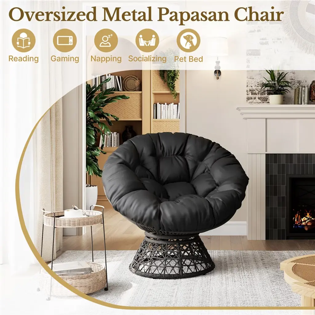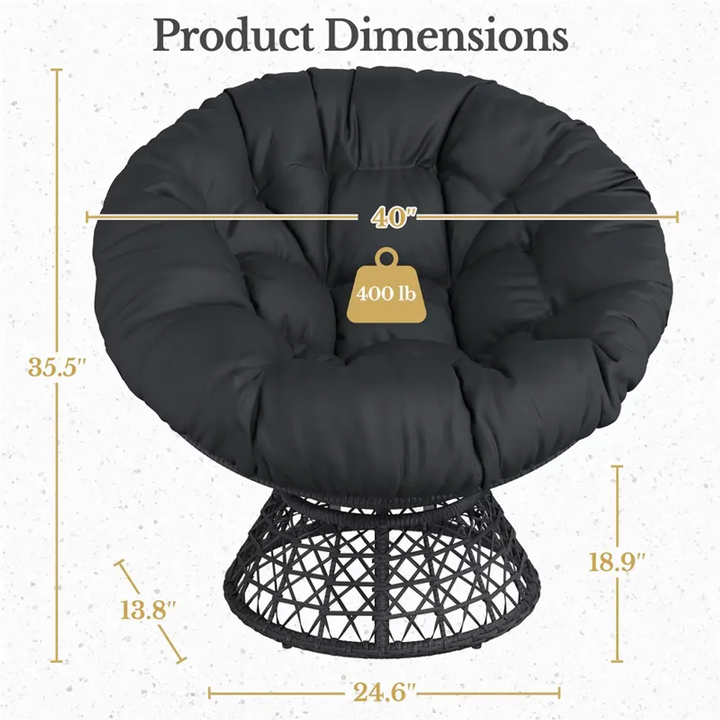 This 360° rotatable Papasan chair combines comfort, style, and functionality. Made with tough PE rattan, it’s weather-resistant and suitable for both indoor and outdoor use. The thick, 11lb cushion provides exceptional comfort, while the curved backrest offers proper support. Inspired by a bird’s nest, its cozy design adds a rustic charm to any space. The removable cushion lets you customize the look, and the space-saving frame fits into smaller rooms, making it a great addition to any home or garden. Specification: Color: Black, Black and BeigeMaterials: HDPE, 180g Polyester, Iron, Silk Floss Assembled Dimensions: including cushion: 40" L × 35.5" W × 35.5" H; not including cushion: 39.5" L × 35.5" W × 33" H; cushion: 47.2" Dia. × 2.4" ThicknessSeat Dimension:Not Including Cushion: 23" Depth × 39.2" W × 22.4" Backrest Height;Including Cushion: 19.7" Depth × 39.8" W × 19.3" Backrest HeightMaximum Weight Capacity: 200 lb Please see the image for exact measurements. Please allow ± 0.4" measurement tolerance.
