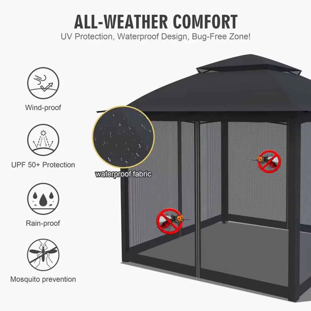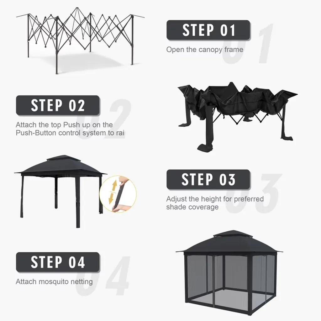 Enjoy instant shade and comfort with the YARDSIGHT 11x11 Ft Pop-Up Gazebo. Featuring a quick pop-up design, it can be set up in just one hour. The durable canopy provides reliable all-weather protection, and the removable mosquito netting keeps bugs at bay so you can relax in peace. Lightweight yet sturdy, this portable gazebo is ideal for camping, tailgating, sporting events, patios, gardens, and backyard gatherings. Wherever you go, it delivers shade, comfort, and convenience all in one.