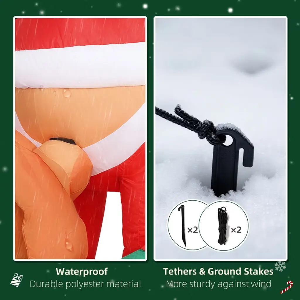 Turn your front yard into a holiday laugh riot with our “Santa vs. Playful Pup” hanging inflatable. Santa dangles mid-air, legs flailing, as a mischievous dog tugs his pants. When the sun goes down, it shines even brighter: dual white LED arrays (built into Santa’s body and the dog’s head) cast a warm, eye-catching glow, ensuring your display stands out against dark winter nights. No more tedious setup: the included air blower inflates it in minutes, and 2 ground stakes + 2 tethers keep it rock-steady when hung from gutters—so it stays put, even on breezy evenings.Built to last through seasons: water-resistant polyester fabric shrugs off rain, snow, and moisture, keeping its vibrant colors and playful charm year after year.