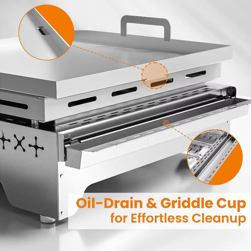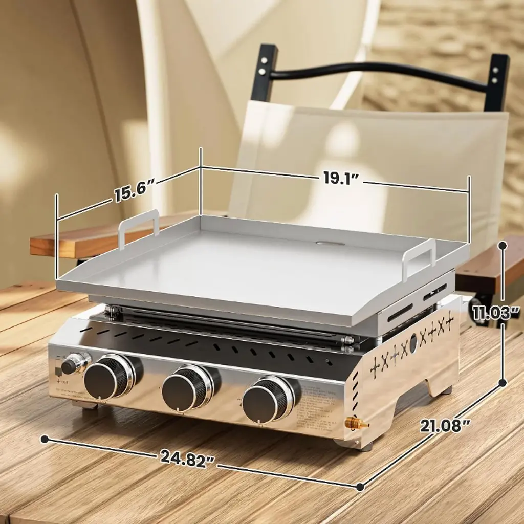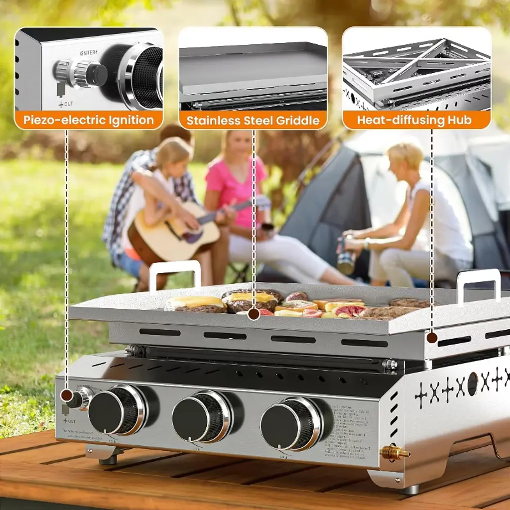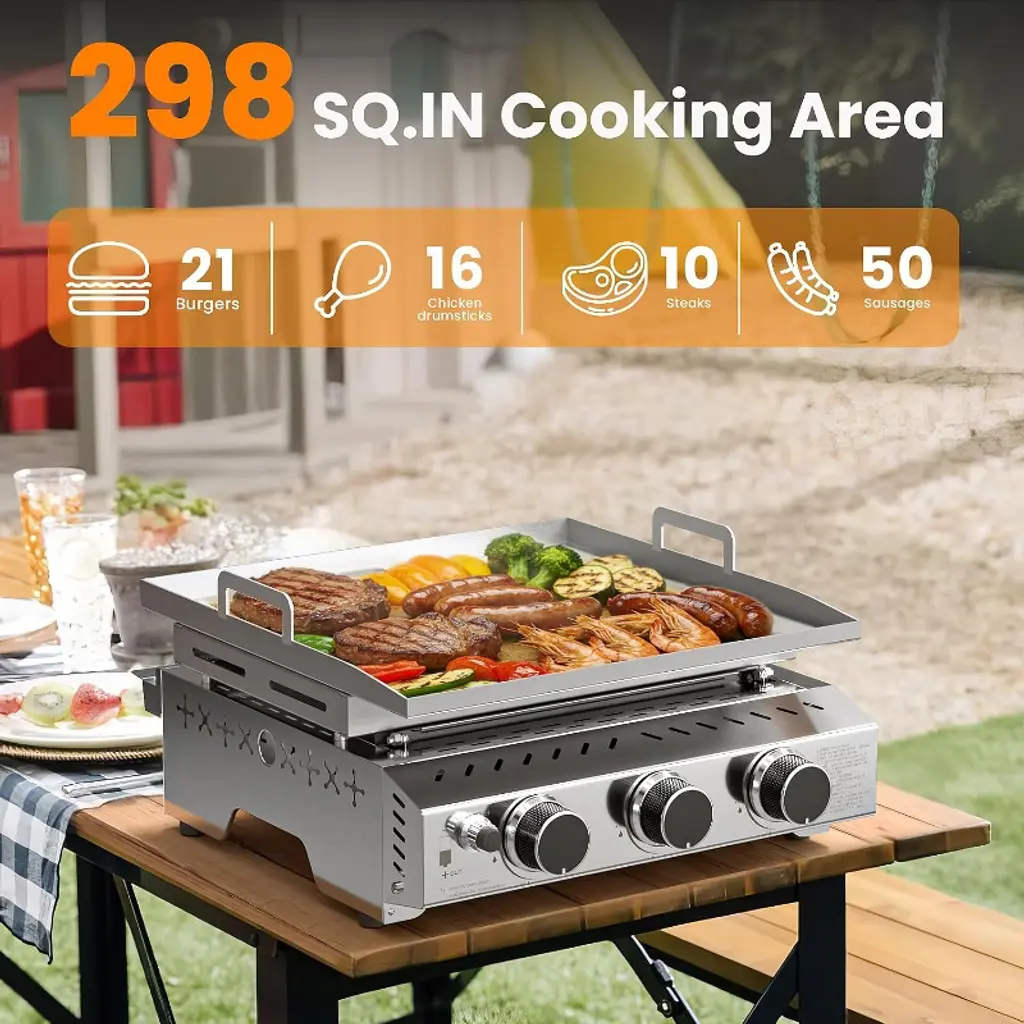 The Stainless Steel Griddle: Made with rust-proof steel for fast, even heating. Three burners (24,000 BTU total) for powerful, precise cooking. Easy cleanup with grease drain & removable cup. Durable, efficient & perfect for outdoor grilling.