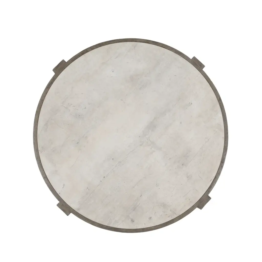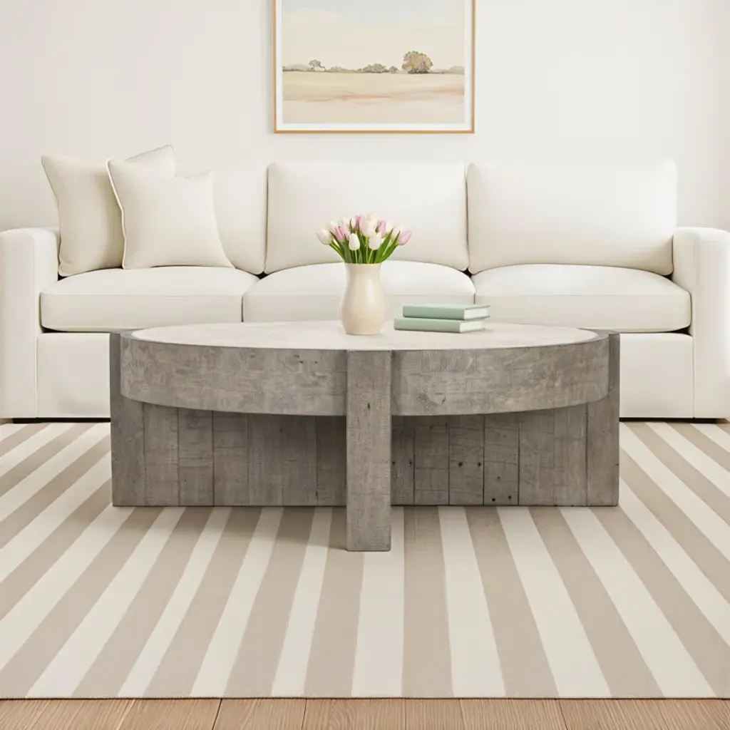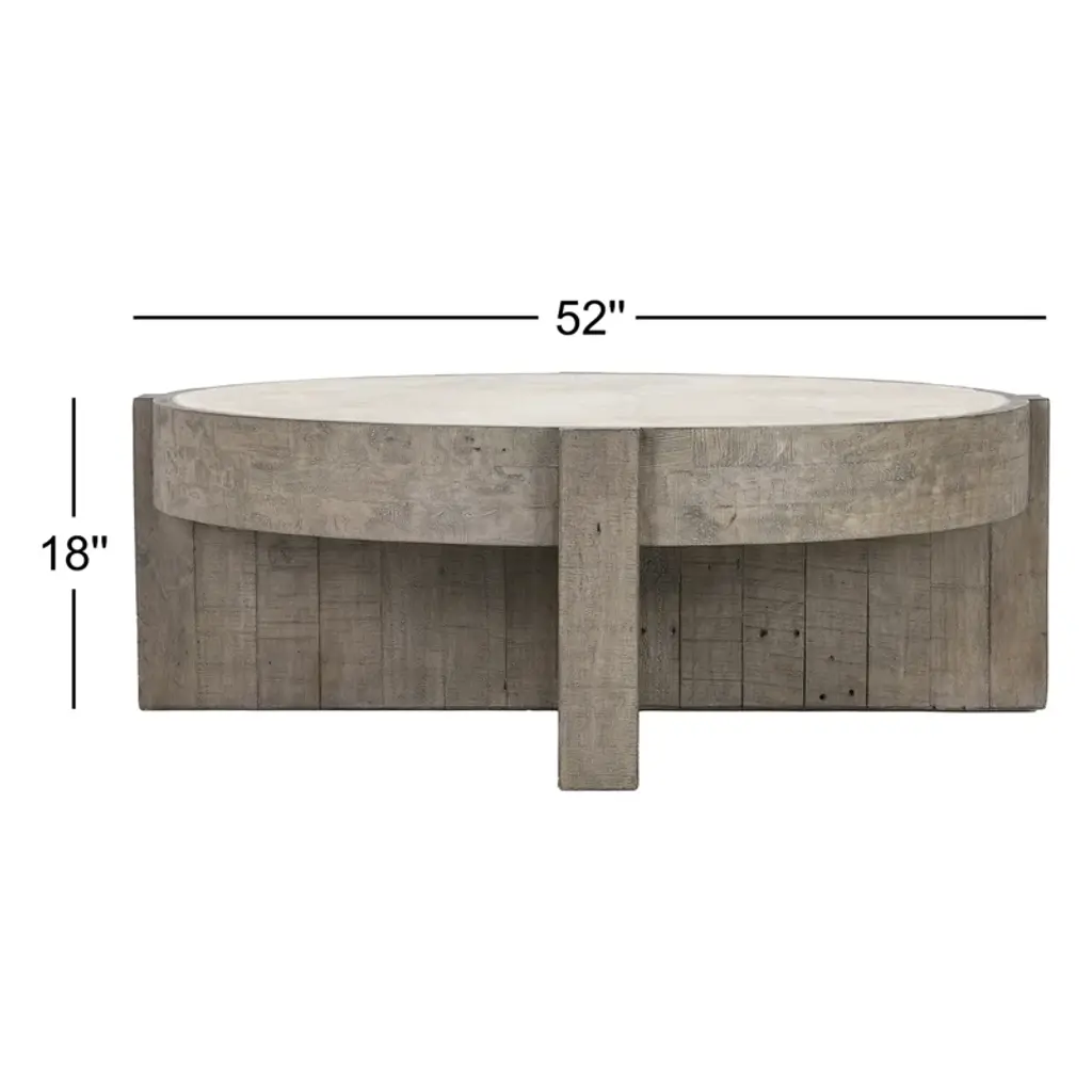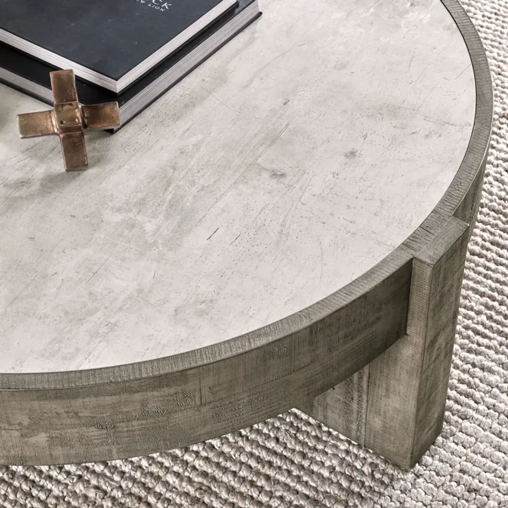 This round coffee table brings a rugged, organic vibe to your living room or den. Crafted from a blend of solid and engineered wood, it features a pedestal base with a Corsican gray finish that contrasts with the weathered white tabletop. The natural wood grain and knots give this table a distinct, rustic character that complements a variety of decor styles from classic to coastal. With a 170 lbs. weight capacity, it's ready to hold your favorite books, magazines, and decorative accents. Pair it with a cozy armchair or sofa to create a welcoming space for relaxation and conversation.