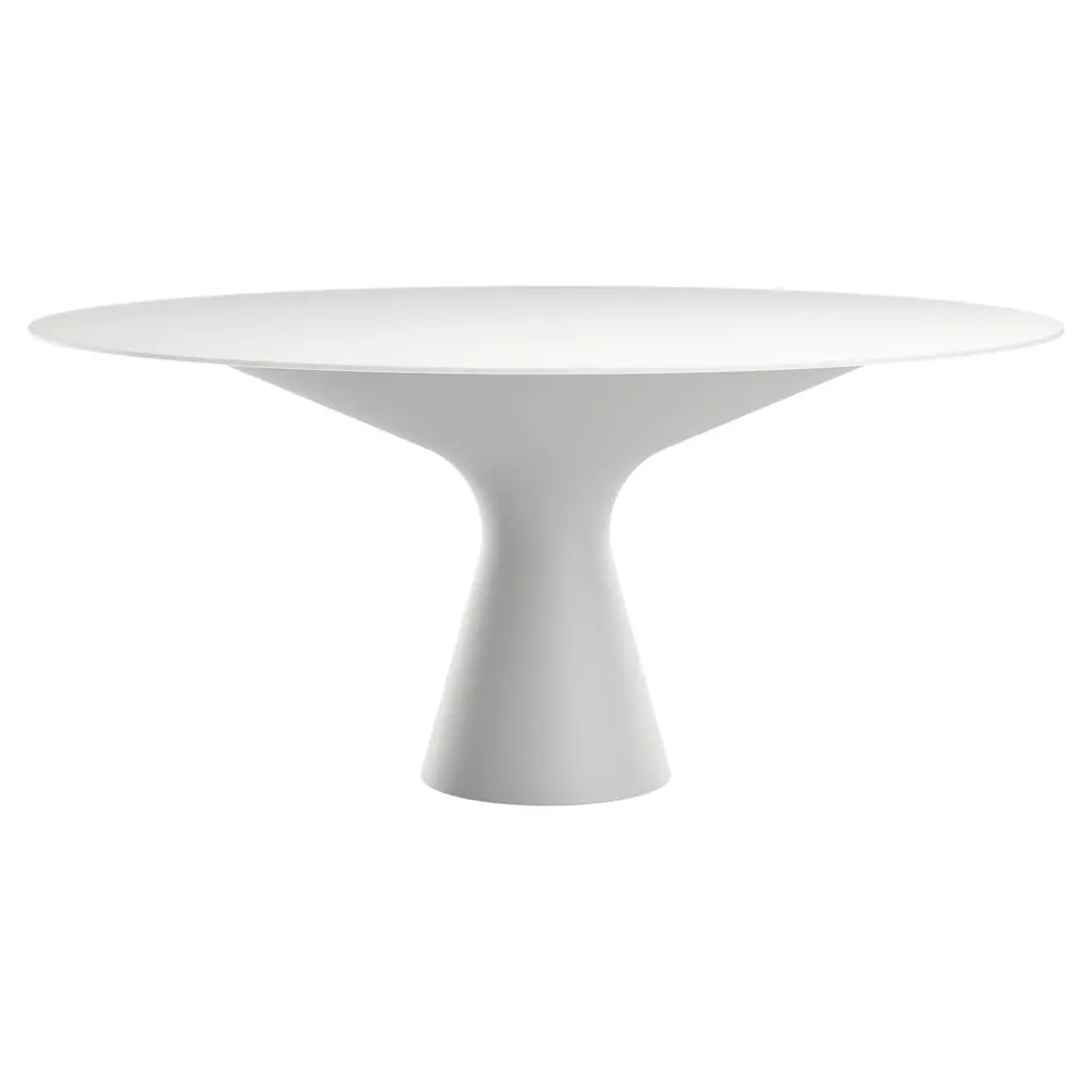 Zanotta Large Elica Table in Clear Glass Top with White Frame by Prospero RasuloBase in Cristalplant®, composite material based on polyester and acrylic resins, loaded with minerals and mass pigmented in the shade of matt white, or black glossy lacquered. 1/2” thick plate glass top, clear or smoky grey, only matching the black base.Additional Information:Material: Polyester and acrylic resinsTop finish: Clear glassFrame finish: WhiteDimension: ø 158 x 72.5 H cmAvailable in other size options: ø 138, 128x198, 138x238Available in other top finish option: Smoky glassAvailable in other frame finish option: Black