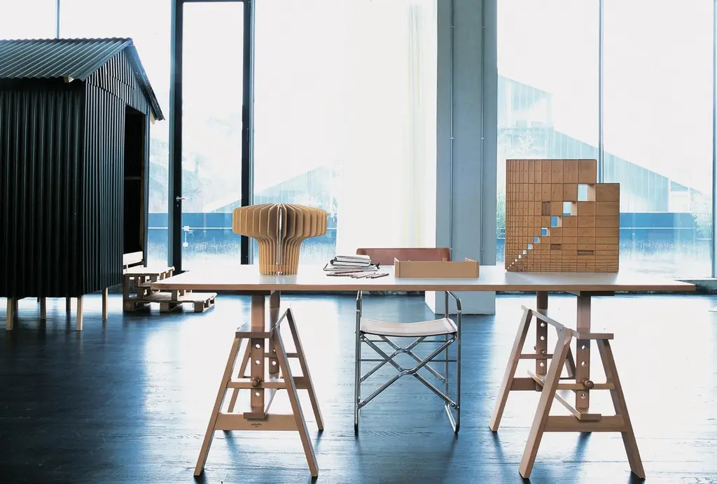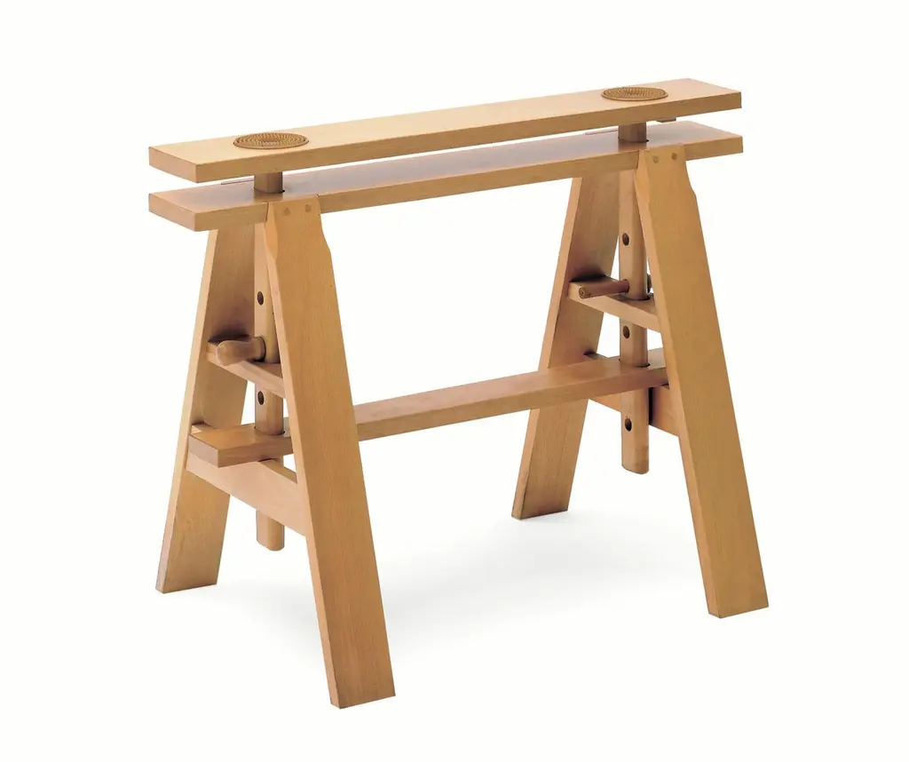 Zanotta Leonardo Working Table in Laminate Top and Natural Varnished Beech Frame by Achille CastiglioniNatural varnished steam-treated beech trestle. 1” thick , particleboard top coated with white plastic laminate, or 1/2” thick, tempered plate glass top. Height adjustable to five positions.Leonardo is a table “of the memory”, being the archetype of worktables on trestles. Its design reflects the philosophy of his designer according to whom “design has always existed and the best objects are those not signed by the architects”. This product resembles the elements of Zanotta’s production philosophy: essentiality, simplicity, best quality of the materials, excellence of workmanship, care to detail.Additional Information:Material: BeechTop finish: LaminateFrame finish: Natural varnished steam-treated beech trestleDimension: 200 W x 100 D x 65 - 91 H cmAvailable in other top finish option: Glass