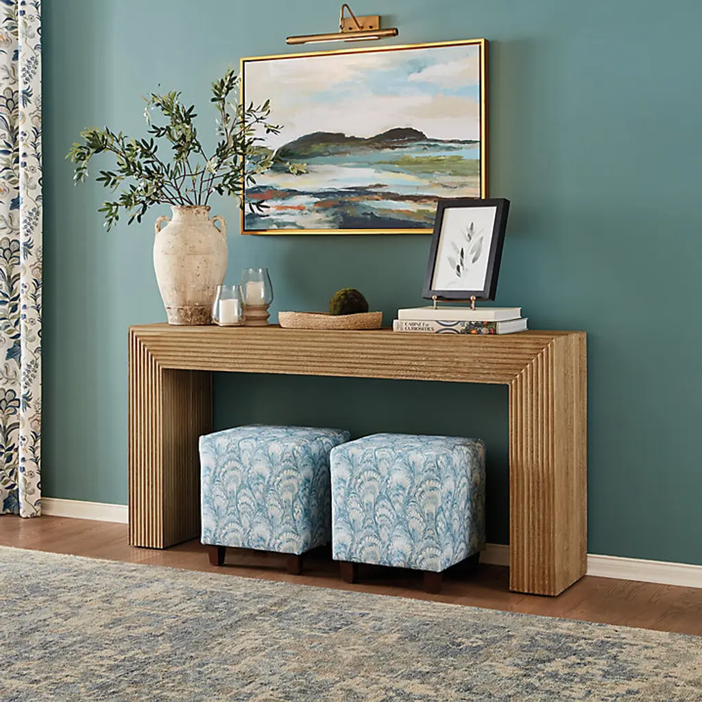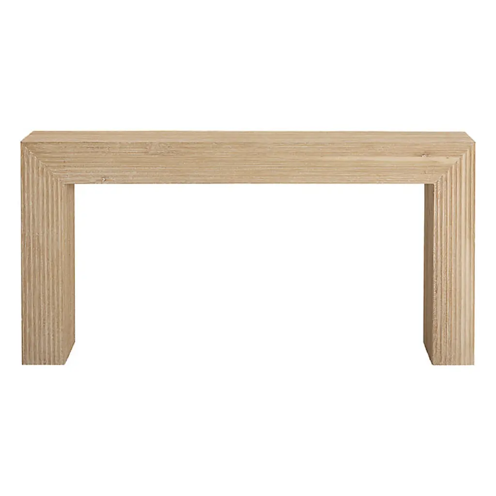 Our Zarah Console Table is so invitingly textured, you can’t resist the impulse to touch it. The clean-lined, square “U” shape is artisan crafted of oak and hand finished on every visible surface with beautiful reeded details. Corners are precisely mitered so reeding runs in continuous lines, emphasizing the impressive architectural silhouette. Scaled to fill an important wall in the living room, entryway, or the space behind a sofa, this substantial console table is just the right height for showing off art above while tucking a couple of cubes underneath. Zarah Console feature: