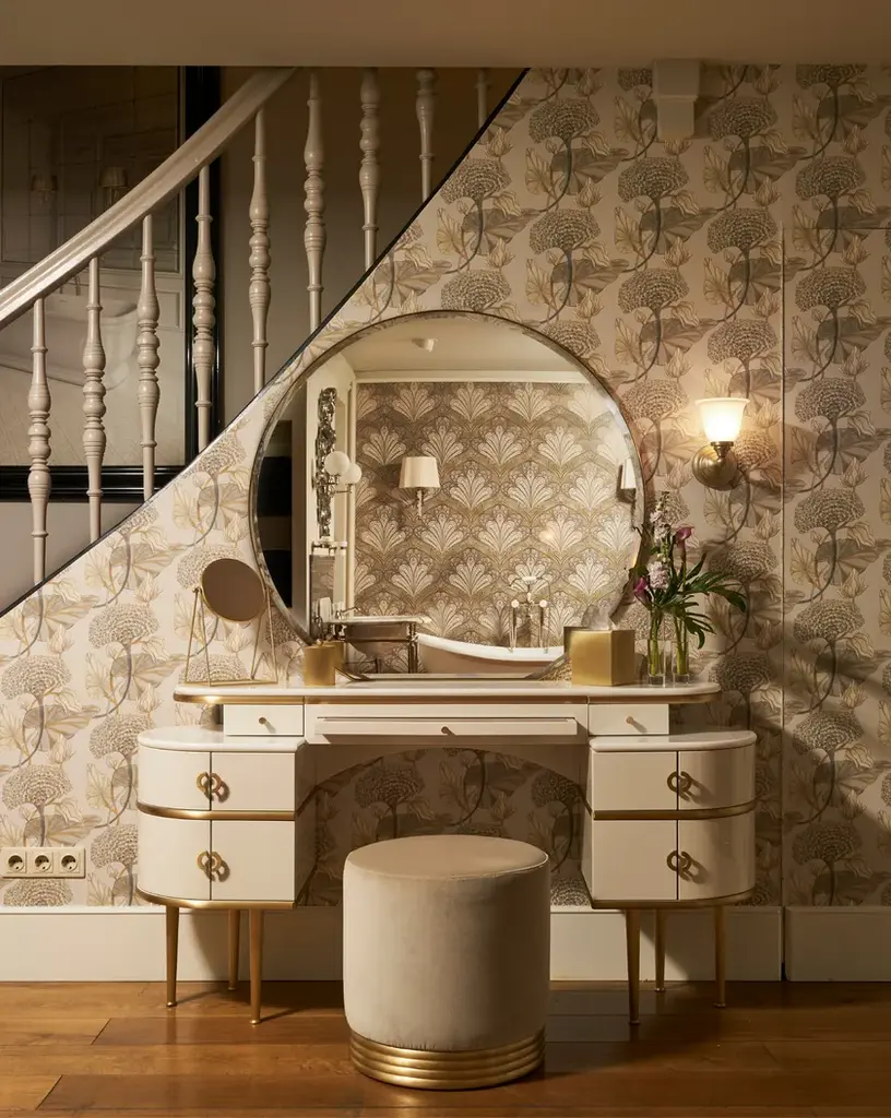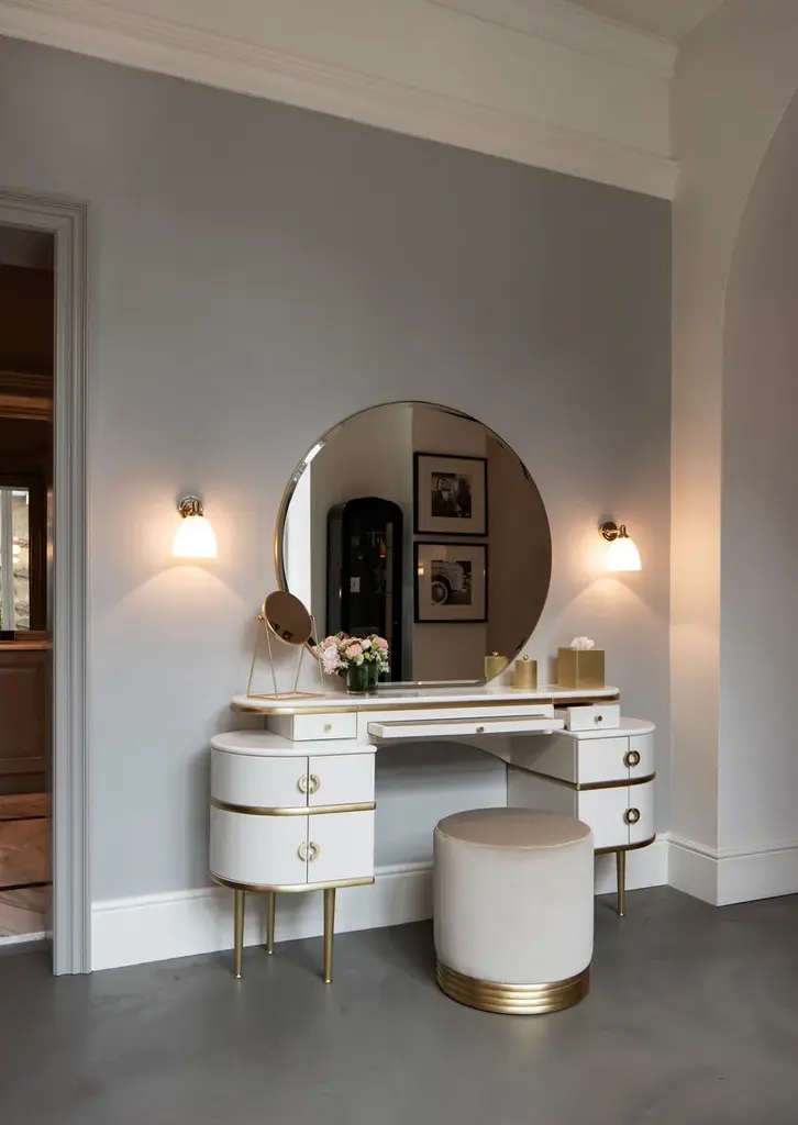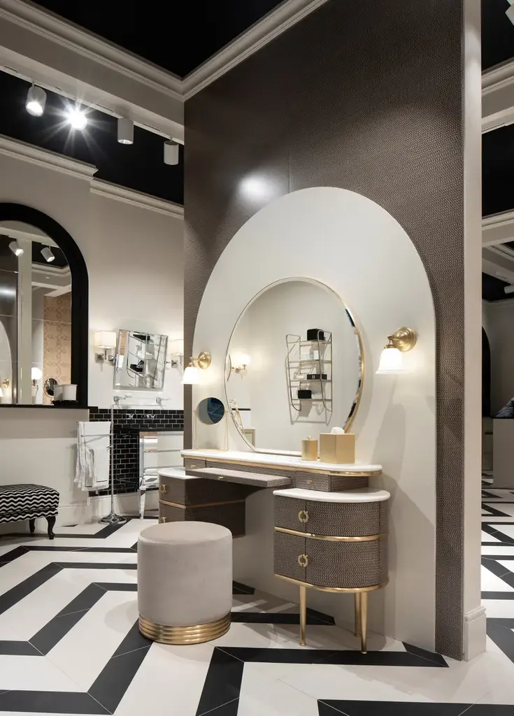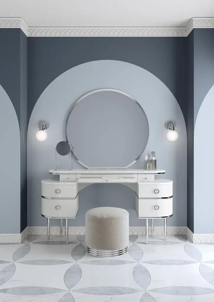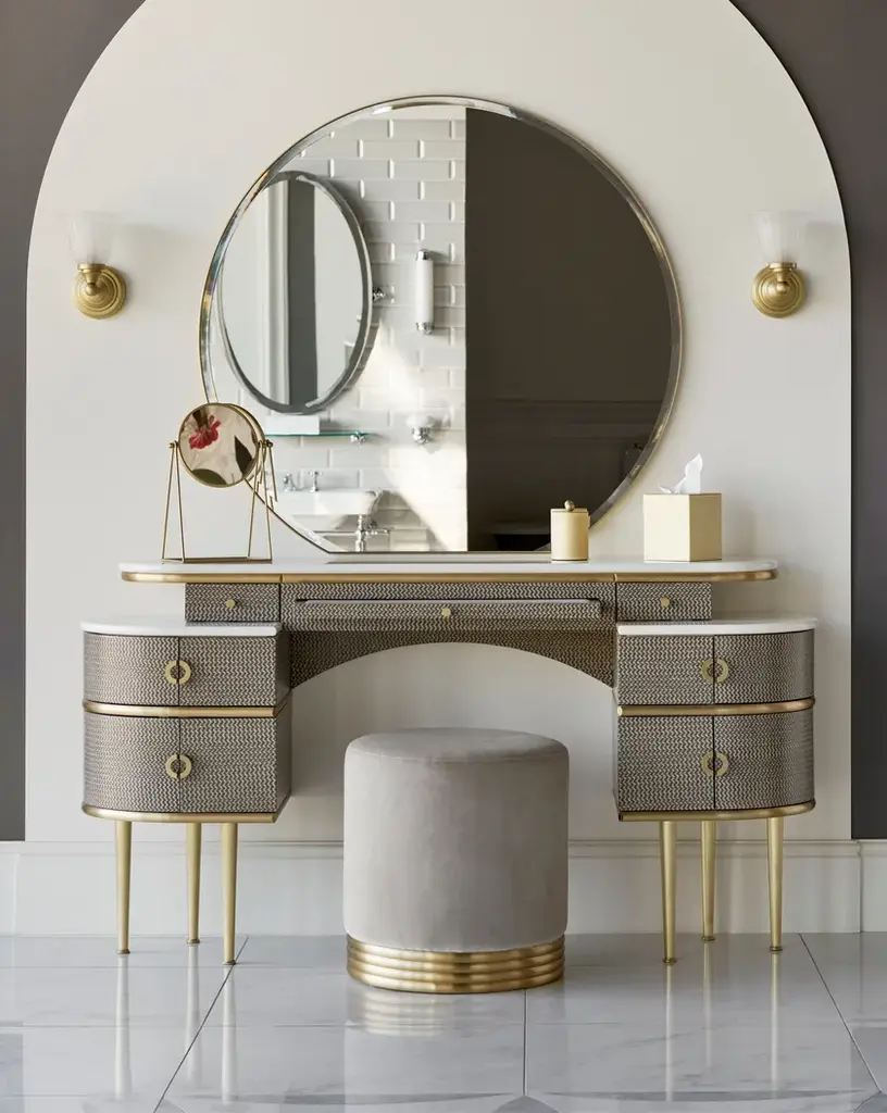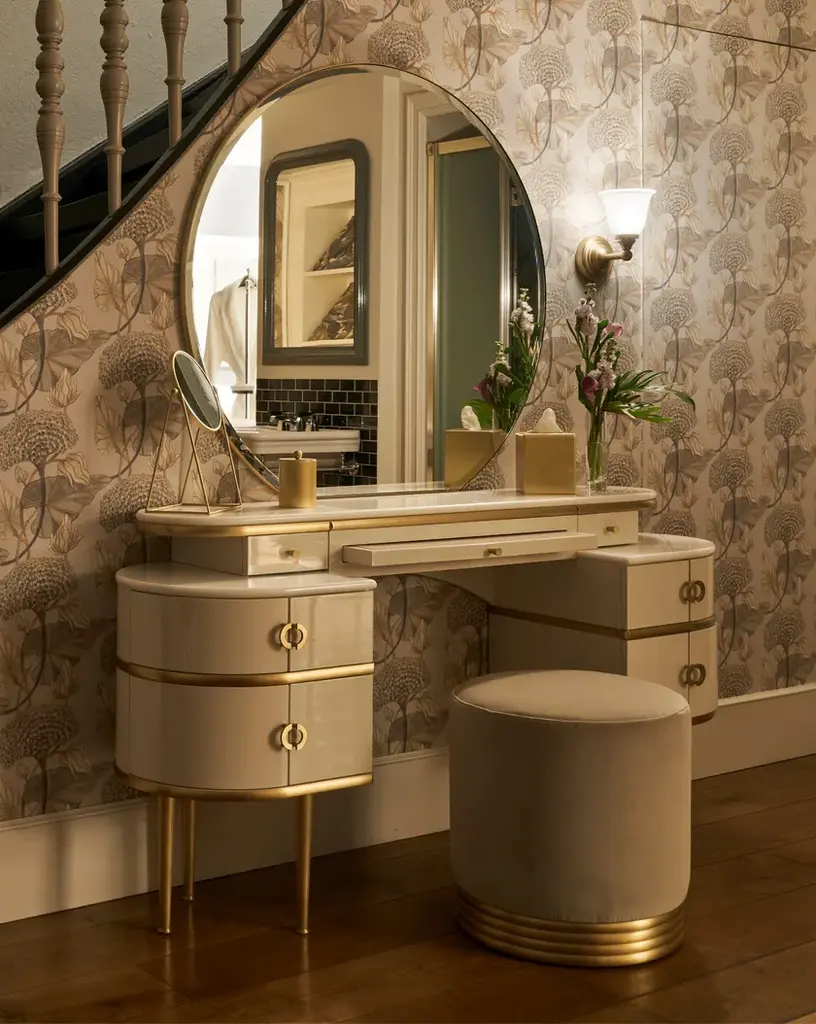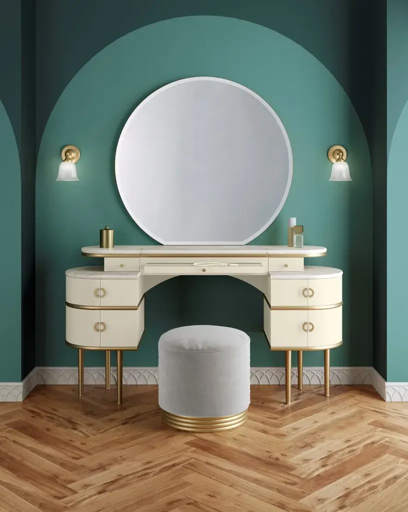 Zelda pays homage to unconvential feminity and irresistible charisma of the author's wife and muse of "The Great Gatsby", this vanity table revisits the classic bedroom dresser in a contemporary vein. Being bordered with sinuous lines and rounded shapes, which culminate in the wide circumference of the large diamond mirror, it has lacquered wood doors and drawers available in three colours, brass legs and marble top. Between the two drawers there is a pull-out top covered with velvet.Pouf not included.