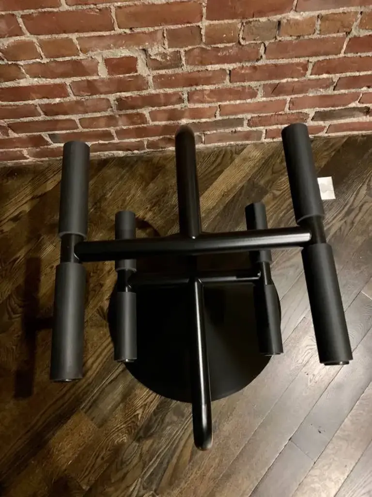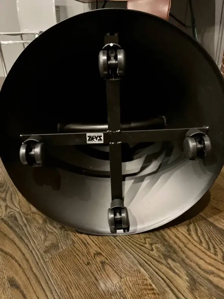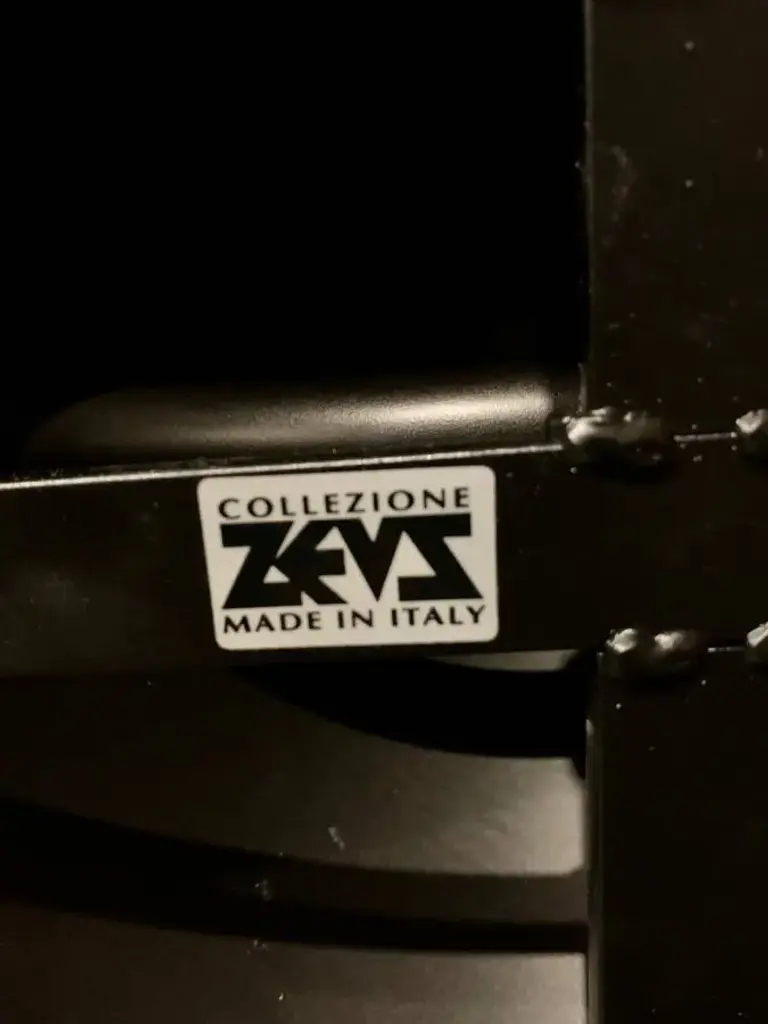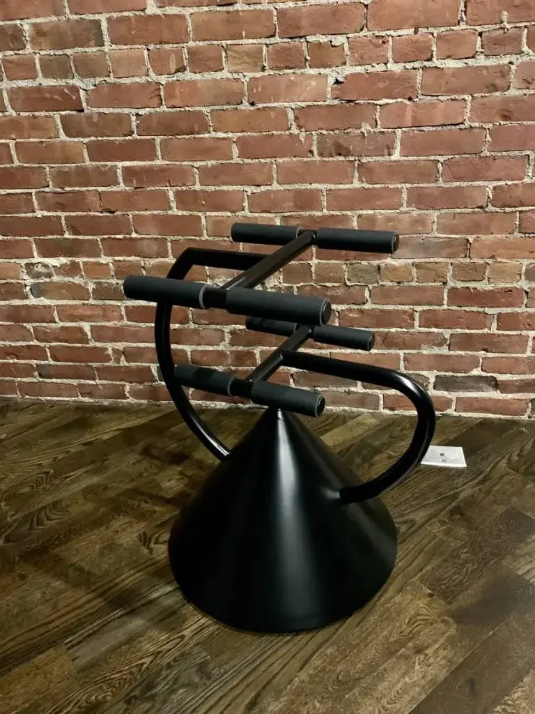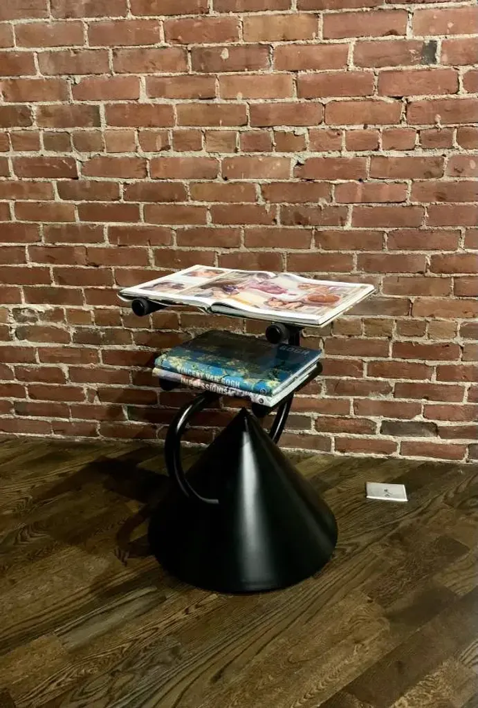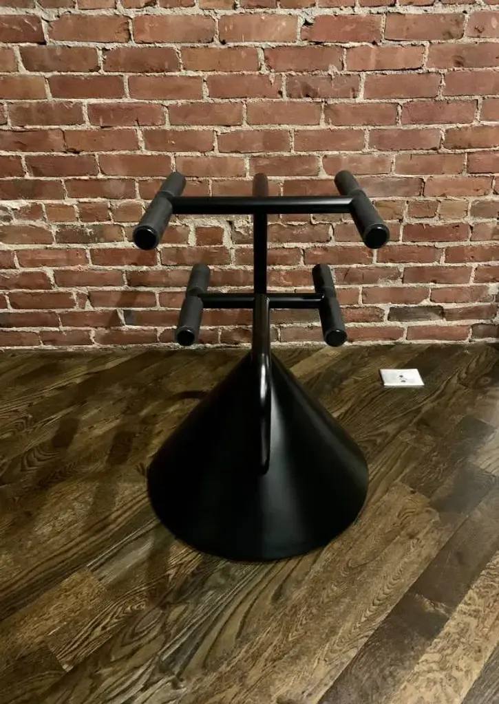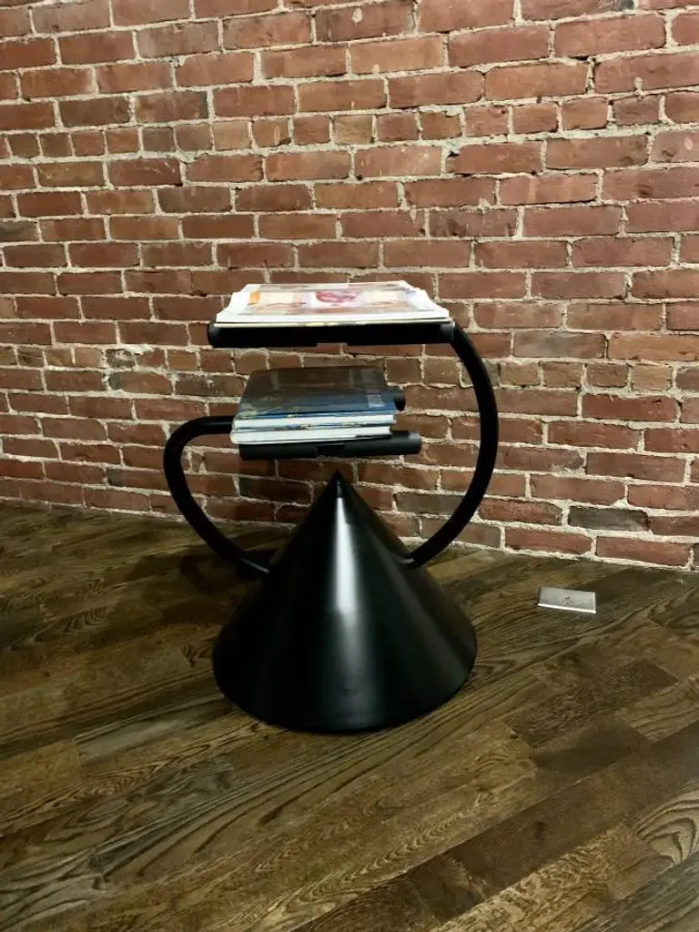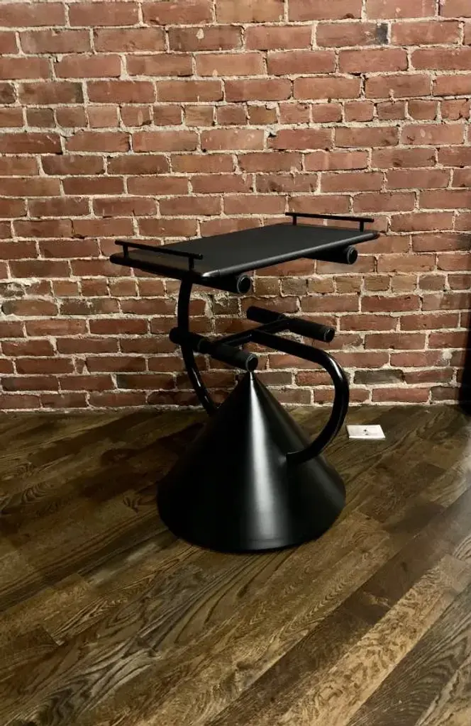 The Hotel Zeus TV stand is a design of Ron Arad - a postmodern-Memphis style masterpiece. It was manufactured by Zeus Noto in Italy in 1992. Ron Arad exhibited at many major museums and galleries throughout the world and his work is considered definitive within public collections of contemporary design, including those at the Centre Georges Pompidou, Paris; Metropolitan Museum of Art, N.Y; Victoria & Albert Museum, London and the Vitra Design Museum, among many others. The conical steel metal base is mounted on invisible casters and glides smoothly and easily. The prongs of the platform are wrapped in soft foam, while the conical base hides caster wheels for easy movement. The entire trolley is made of power coated black metal. Could also be transformed into a display table with the addition of a top (glass or rubber would stay put on the foam rubber covers of the prongs). Would be an amazing display for an art sculpture, art book, a vase or a plant stand. Can also use as shelving for oversized books. One could also easily put together a contraption to allow modern thin screen TV's to work with this piece - in fact, the modern version of this has been reengineered to do so. The black tray top shown is NOT included in the sale. Comes from a smoke-free, pet-free home in PERFECT, NEW condition - not a mark or scratch on it. Signed with decal manufacturer's label to underside: Zeus Made in Italy. Dimensions Height: 27.56 in (70 cm) Width: 20.87 in (53 cm) Depth: 24.02 in (61 cm)