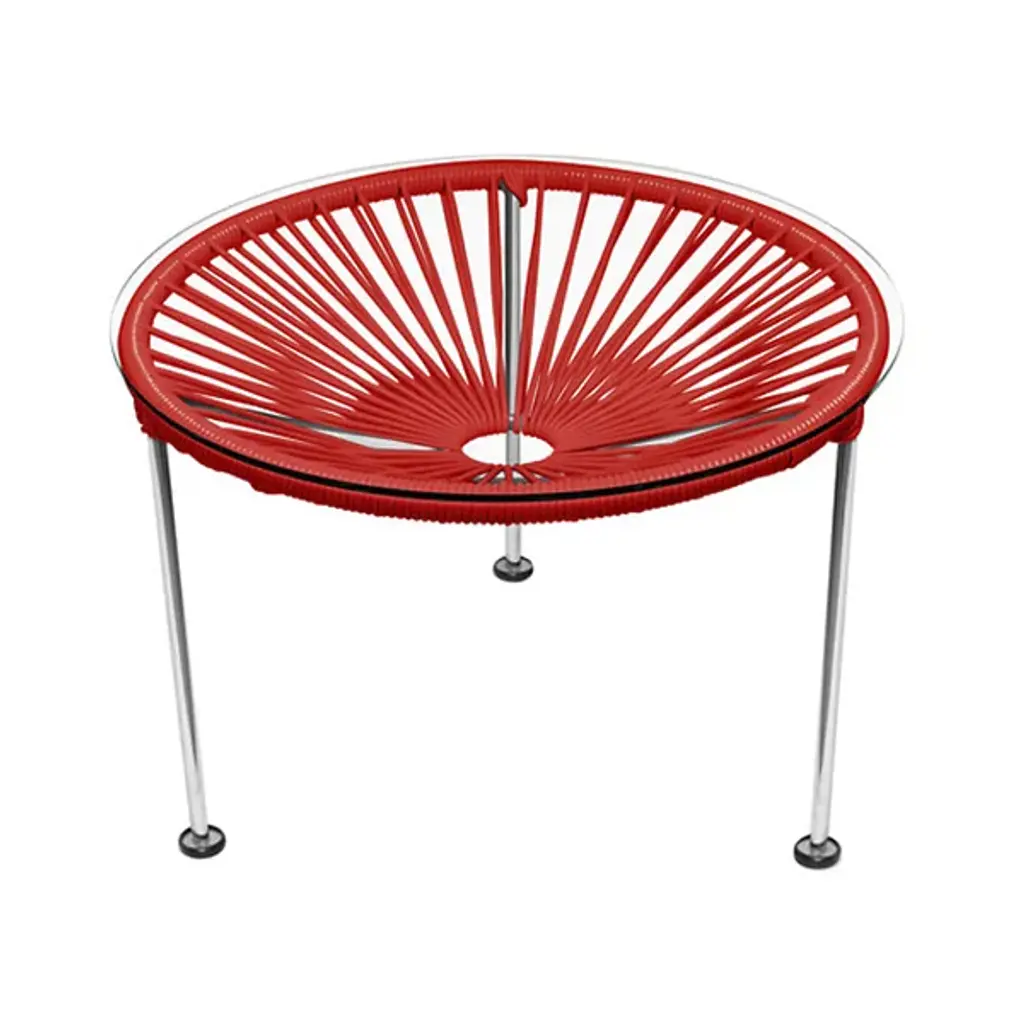 Complete your cool contemporary outdoor look with the Innit Designs Zicatela Table. It matches up with all of the Innit Designs lounges with its hand-woven vinyl strands and simple galvanized steel frame. A round tempered glass top allows the colorful, radially-patterned vinyl to show through while providing a useful surface for drinks, books or plants. Note: Chrome and copper frame finishes are suitable for indoor use only.