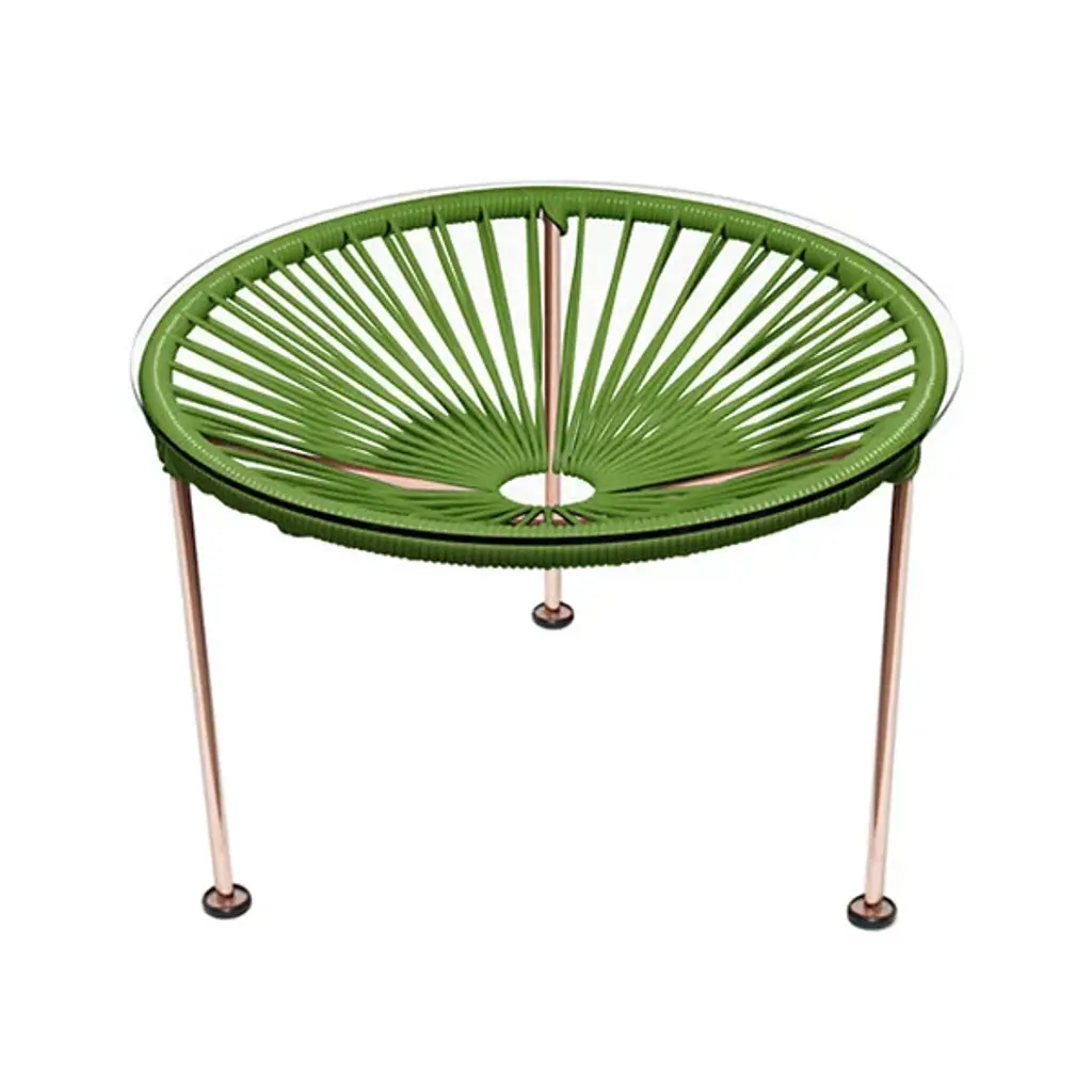 Complete your cool contemporary outdoor look with the Innit Designs Zicatela Table. It matches up with all of the Innit Designs lounges with its hand-woven vinyl strands and simple galvanized steel frame. A round tempered glass top allows the colorful, radially-patterned vinyl to show through while providing a useful surface for drinks, books or plants. Note: Chrome and copper frame finishes are suitable for indoor use only.