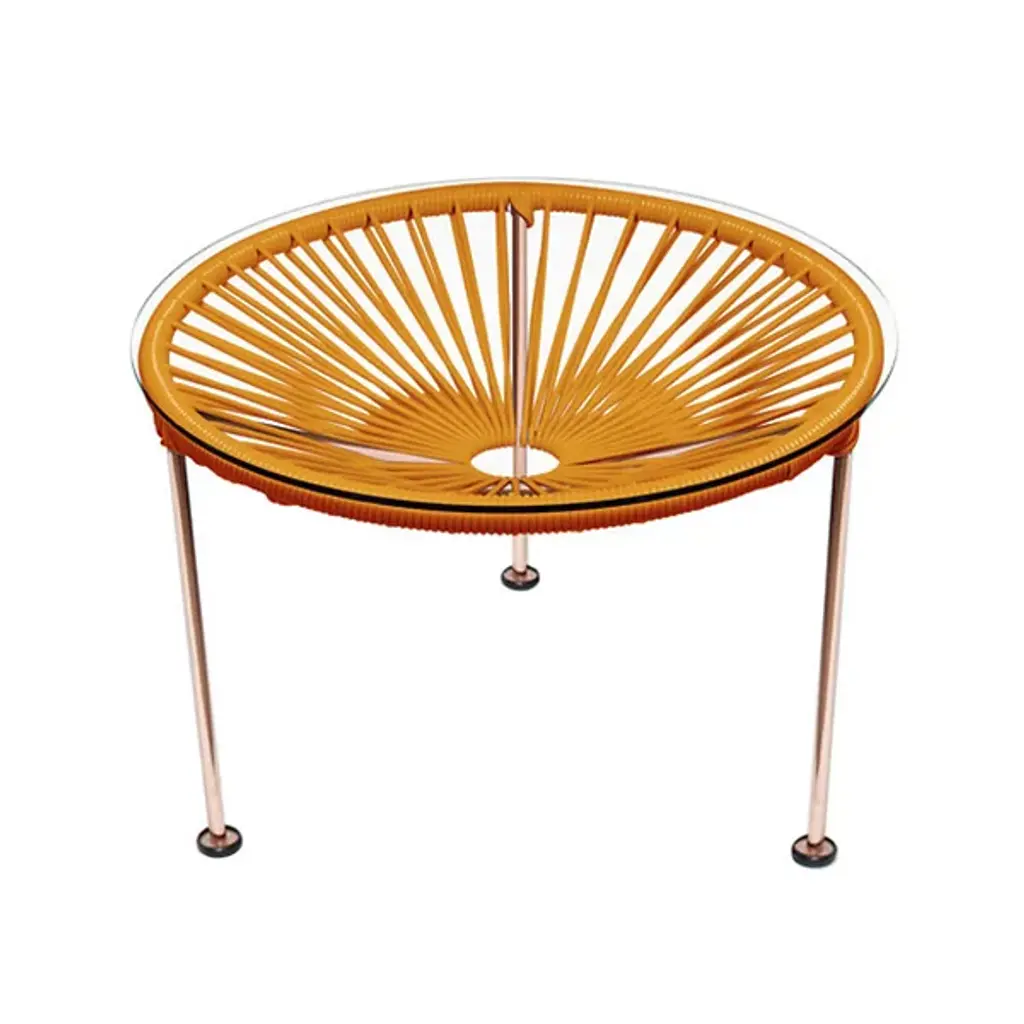 Complete your cool contemporary outdoor look with the Innit Designs Zicatela Table. It matches up with all of the Innit Designs lounges with its hand-woven vinyl strands and simple galvanized steel frame. A round tempered glass top allows the colorful, radially-patterned vinyl to show through while providing a useful surface for drinks, books or plants. Note: Chrome and copper frame finishes are suitable for indoor use only.