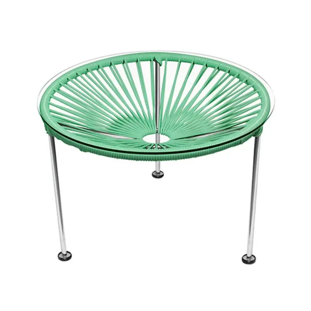 Complete your cool contemporary outdoor look with the Innit Designs Zicatela Table. It matches up with all of the Innit Designs lounges with its hand-woven vinyl strands and simple galvanized steel frame. A round tempered glass top allows the colorful, radially-patterned vinyl to show through while providing a useful surface for drinks, books or plants. Note: Chrome and copper frame finishes are suitable for indoor use only.