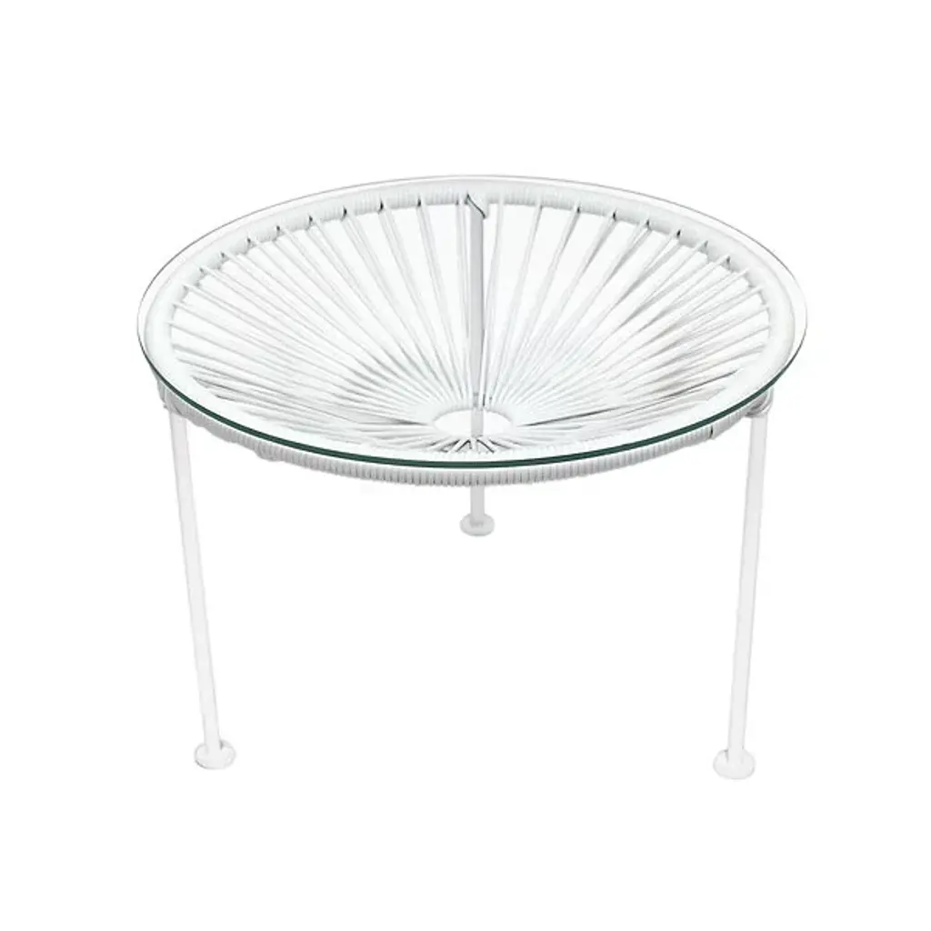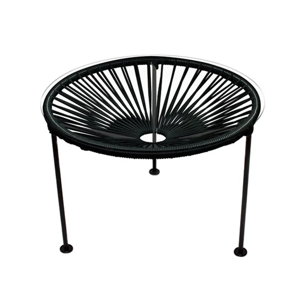 Complete your cool contemporary outdoor look with the Innit Designs Zicatela Table. It matches up with all of the Innit Designs lounges with its hand-woven vinyl strands and simple galvanized steel frame. A round tempered glass top allows the colorful, radially-patterned vinyl to show through while providing a useful surface for drinks, books or plants. Note: Chrome and copper frame finishes are suitable for indoor use only.
