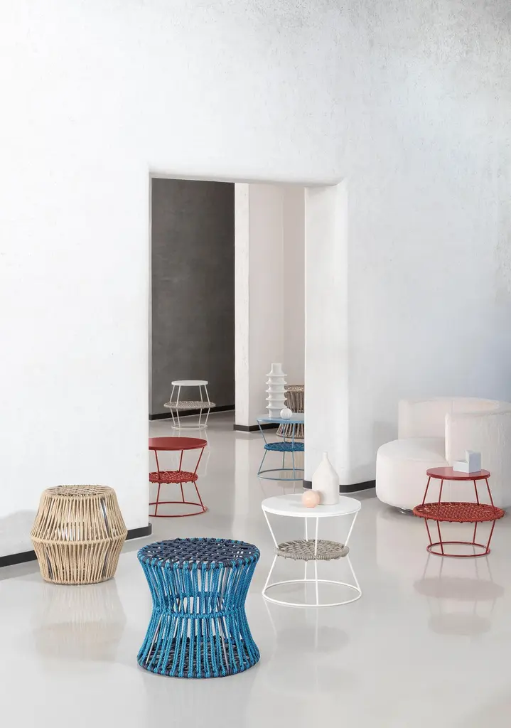 Metal, wood, rope: simple materials which reinvent commonly used objects. A collection of poufs and coffee tables made in metal rods and woven nautical cords, mixed together like the paints on an artist’s palette. The reference to David Bowie’s iconic Ziggy Stardust is no accident and relates to the irony in the idea of revolutionising the type of accessory furniture in the area for relaxing. The barrel and hourglass silhouettes come together to make up islands which expand: interweaving and volumes are enhanced in the coordination of the mixed colours of the cord, pointing to a new idea of furnishing accessory with endless possibilities of personalising the space. The two-tone plaited rope is an exclusive Saba combination.Architect, designer, artist. Emilio Nanni has a degree in Architecture from the University of Florence. He has worked as a lecturer and researcher at the same faculty, and held lessons and workshops at several Italian university faculties and design schools. He is the founder of the Emilio Nanni arch+design ENa+d studio, which handles projects in the fields of architecture, design, interior design, art direction and design consultancy. As an architect he has designed and built residential buildings of various sizes in several Italian cities. He has worked as a designer for many Italian firms, including Billiani/Novecentoundici, Bross, Cabas, Calligaris, LaboratorioPesaro, Lamm, Mdf Italia, Guzzini, Roche Bobois, Saba, Tonelli, Tonon, Valadier Gioielli, Zanotta and Zeritalia. He has participated in many exhibitions and shows in the sector and his work has been featured in articles and critical essays in the leading Italian and international architectural periodicals, magazines, blogs and websites. He is also a painter, who has displayed his work in several solo exhibitions in galleries and museums in Italy and abroad, and his work is featured in various public and private international collections.Additional information:Material: Metal, wood, ropeFrame: Glossy grayTop: Opaque grayRope finish: Melange white - blackDimensions: Ø 44 x 40 H cmAvailable in other frame finish options: Glossy red, glossy blueAvailable in other top finish options: Opaque red, opaque blueAvailable in other rope finish options: Melange hemp, melange orange, melange blueAvailable in other sturctural options