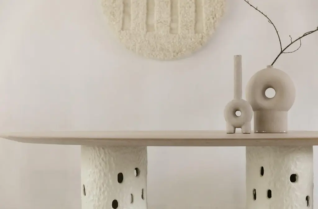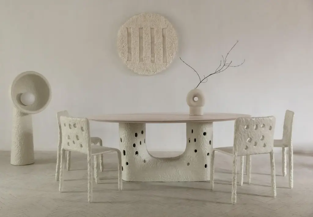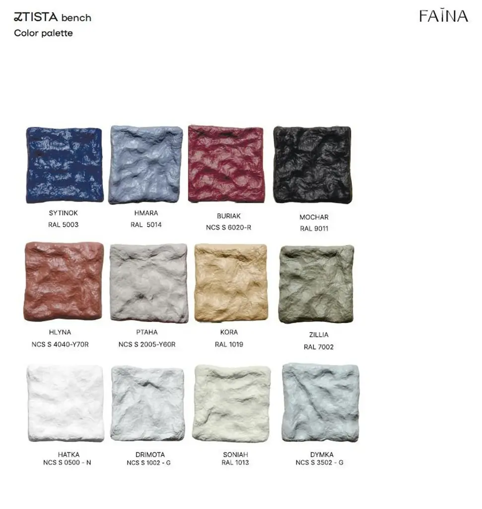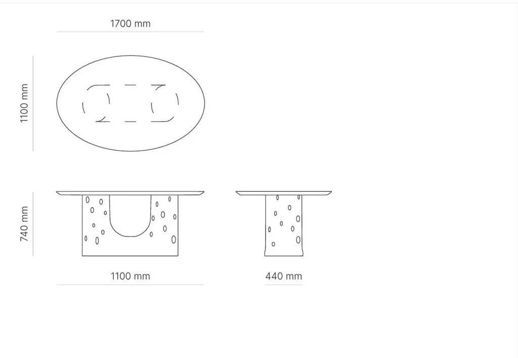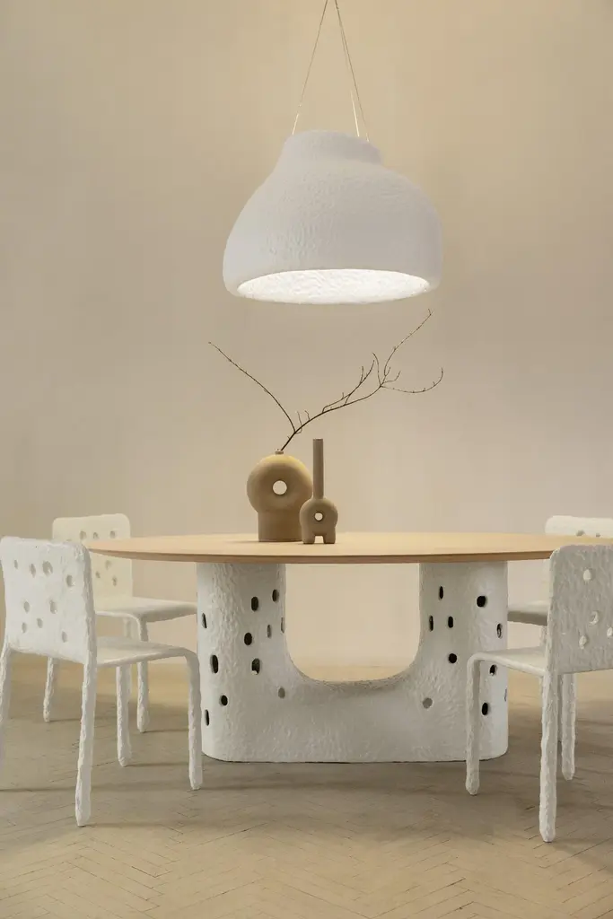 ZTISTA / Ukrainian for made of dough /ZTISTA oval table — the leg, hand-sculpted of FAINA’s eponymous material — ZTISTA a sustainable blend of clay, hay and other recycled materials, designed to one day return to nature. ZTISTA is about tactility, pure energy, gut feelings. Spontaneous and emotional, ZTISTA oval table features a living ash-wood top and signature holes. Made with a technique similar to the Ukrainian craft of valkuvannya, once used for wall finish, each piece slightly differs, casting the process of handcrafted creation. MATERIAL: Upcycled steel frame and live ZTISTA material – a blend of cellulose, clay, flax fiber, wood chips, biopolymer cover. Wooden table top. COLORS: 12 Ztista clors, semi-gloss GU 30. The table top color: black, natural. Suitable for 6-8 person.Please kindly note that handcrafted items may slightly differ in shades and textures. Only for indoor use, outdoor is an option. Maximum load 30 kg.
