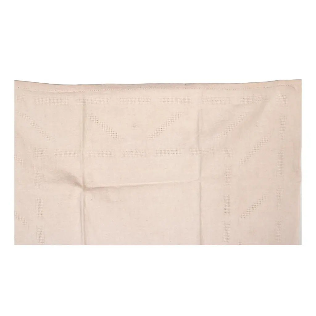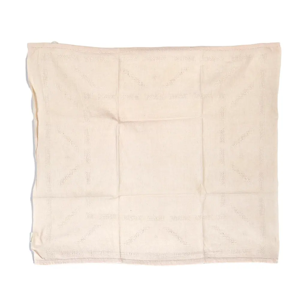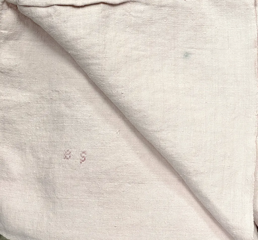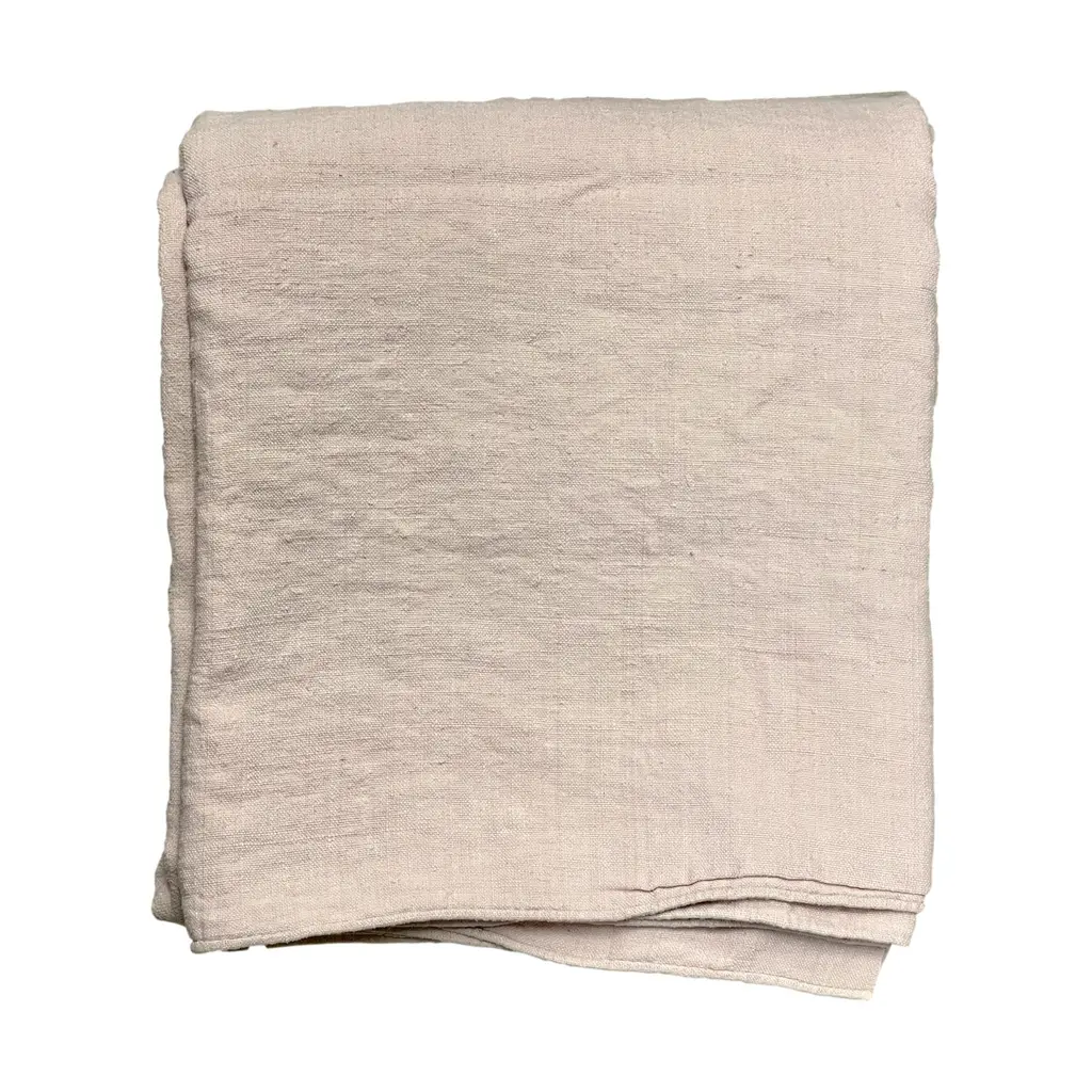Antique French hemp tablecloth with twelve fancy linen napkins. Made circa 1920. Remarkably there are no monograms, the tiny initials on end are the initials of the seamstress, common in good French linens (see photo). Linens are antique, recently hand-dyed in small batches in Provence, France. They are washed in lavender water and heavily starched. Minor color irregularities are normal and light spots are from ironing with heavy starch (will wash out). Tablecloth 84" x 72"; Napkins 23" x 20".