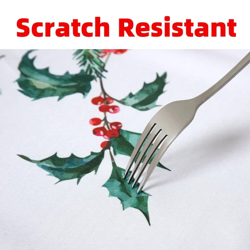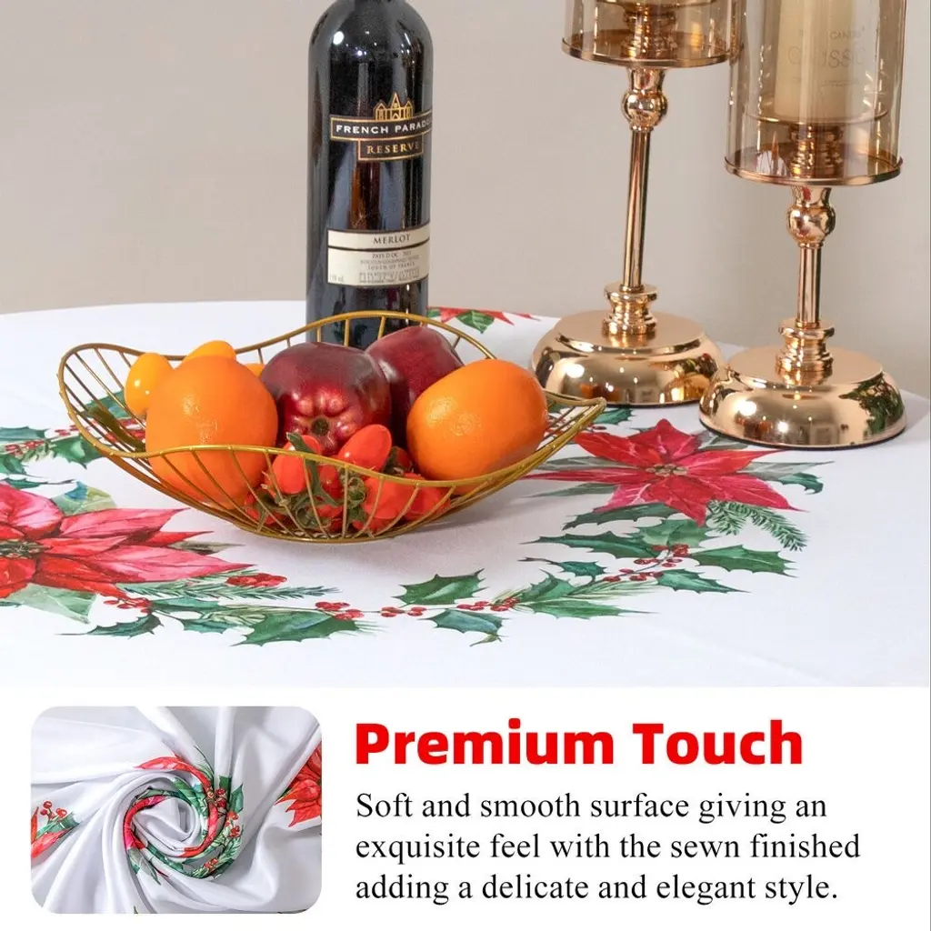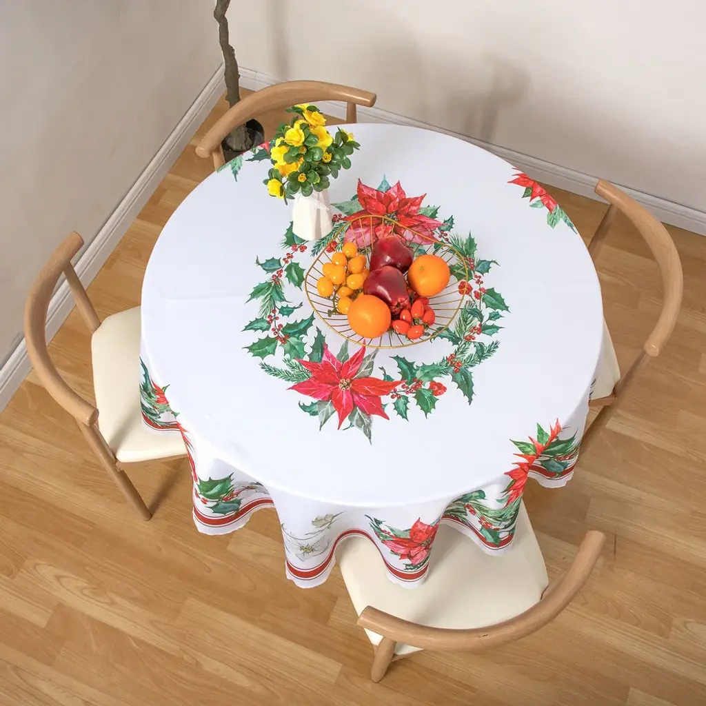 Elevate your seasonal celebrations with the perfect blend of elegance and holiday cheer• Water-proof, oil-resistant, and easy to clean• Weight: 1.21lb (Rectangle), 0.73lb (Round)• Dimensions: 60 inches x 84 inches (Rectangle), 60 inches x 60 inches (Round)Key Features:Charming Christmas Plants Pattern: Bring the enchantment of the holiday season to your table with our eye-catching Christmas Plants pattern. Adorned with festive botanical motifs, this tablecloth adds a touch of nature-inspired beauty to your dining space.Premium Polyester Material: Crafted from high-quality polyester, our round tablecloth combines durability with a luxurious feel. The fabric drapes gracefully over your table, creating an elegant and refined look that enhances the overall ambiance of your festive gatherings.Versatile Round Shape: The round shape of the tablecloth is not only visually appealing but also versatile, fitting a variety of table sizes and shapes. Whether you have a classic round table or a square one, our tablecloth effortlessly adapts to your setting.Vibrant and Fade-Resistant Colors: The vibrant colors of the Christmas Plants pattern are designed to resist fading, ensuring that the festive charm lasts throughout the holiday season and beyond.Perfect for Special Occasions: Whether you're hosting a family dinner, a festive brunch, or a holiday party, our round polyester tablecloth adds a touch of sophistication to any occasion. Create lasting memories against the backdrop of this delightful Christmas-themed design.Timeless Design: The timeless appeal of the Christmas Plants pattern makes this tablecloth a versatile choice. It seamlessly complements various decor styles, making it a staple not only for the holiday season but for year-round entertaining.Great Gift Option: Searching for the perfect holiday gift? Our round polyester tablecloth with Christmas Plants pattern makes for an excellent and thoughtful present, adding festive charm to the homes of your loved ones.Transform your dining space into a winter wonderland with our Round Polyester Tablecloth featuring a delightful Christmas Plants pattern. Order now and infuse your celebrations with the spirit of the season, creating a warm and inviting atmosphere for all your guests.
