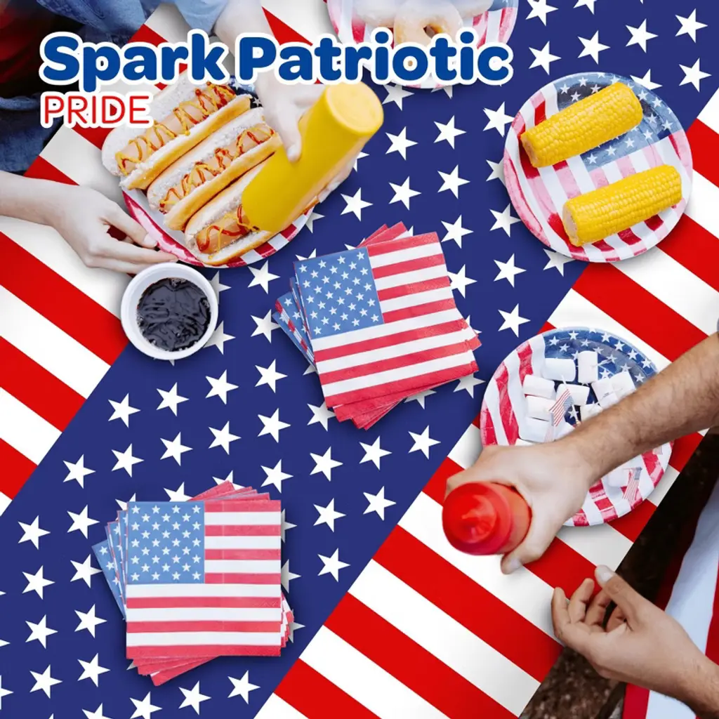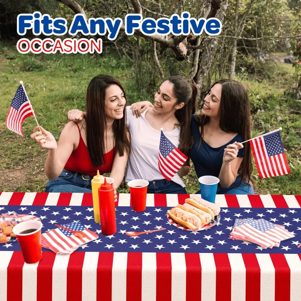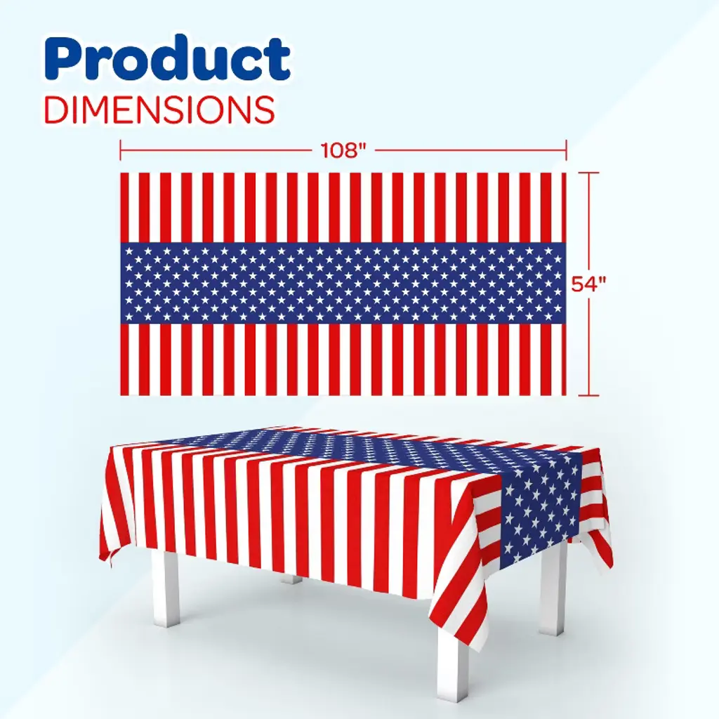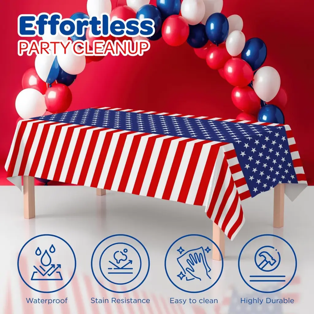 4E’s Novelty 3 Pack Patriotic Table Cloth set elevates your 4th of July decorations! Each disposable rectangle red white and blue table cloth (54"x108") fits red white and blue table cloths for 6/8 foot rectangle tables. With a vibrant American flag-inspired design, these red white and blue table cloths for 6/8 foot rectangle tables bring patriotic flair to Memorial Day picnics, Independence Day BBQs, or graduation tablecloths. Crafted from high-quality plastic and polyvinyl chloride, these waterproof, durable outdoor prep table covers protect against spills and stains. The lightweight rectangle red white and blue table cloth ensures easy setup and cleanup, perfect for outdoor navy blue red, white tablecloth settings. Customers love their sturdy yet soft drape, ideal for kids’ picnic patriotic tables or camping. Pair with 4th of July decorations for a cohesive look.
