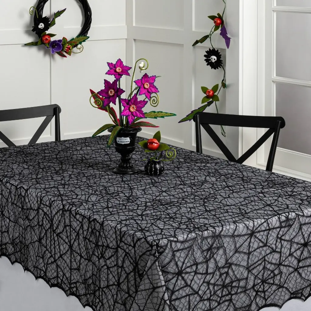 60"x84" Lace Halloween Tablecloth - Hyde And Eek! Boutique™: Eerie Cobweb Design, Polyester Fabric, Festive Dining Decor