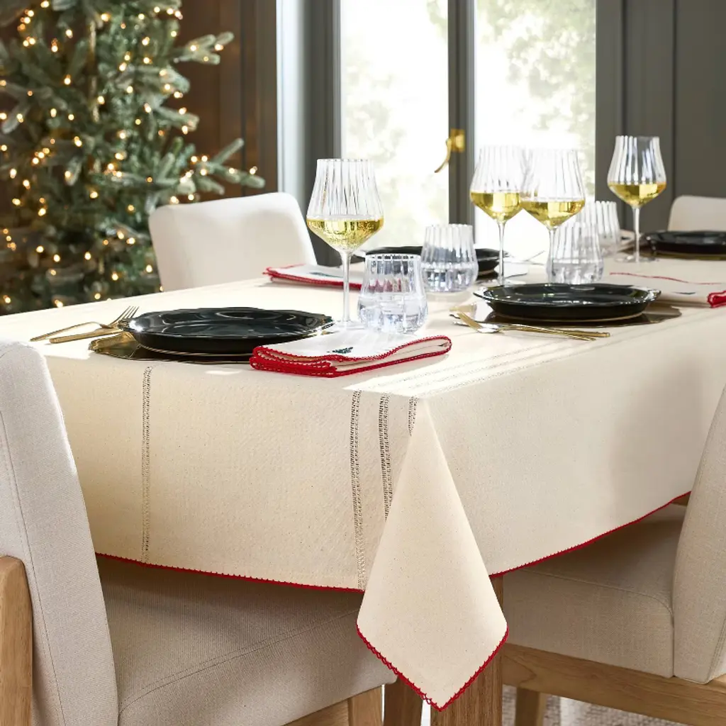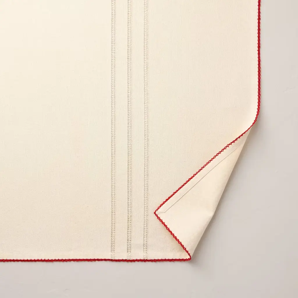 Infuse mealtimes with elegant style with this Tonal Trim Tablecloth from Hearth & Hand™ with Magnolia. Made from 100% cotton, this rectangular tablecloth offers protection against spills, stains, and scratches. Designed in a cream hue, this rectangular tablecloth features a woven striped design with trim in red, while the machine-washable design makes cleaning a breeze.Hearth & Hand™ with Magnolia: Gather • Create • Enjoy
