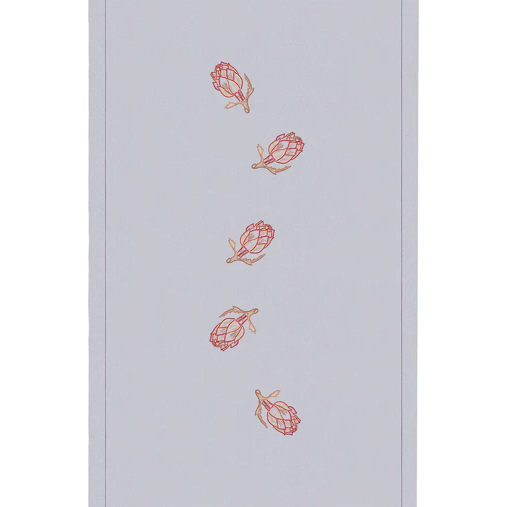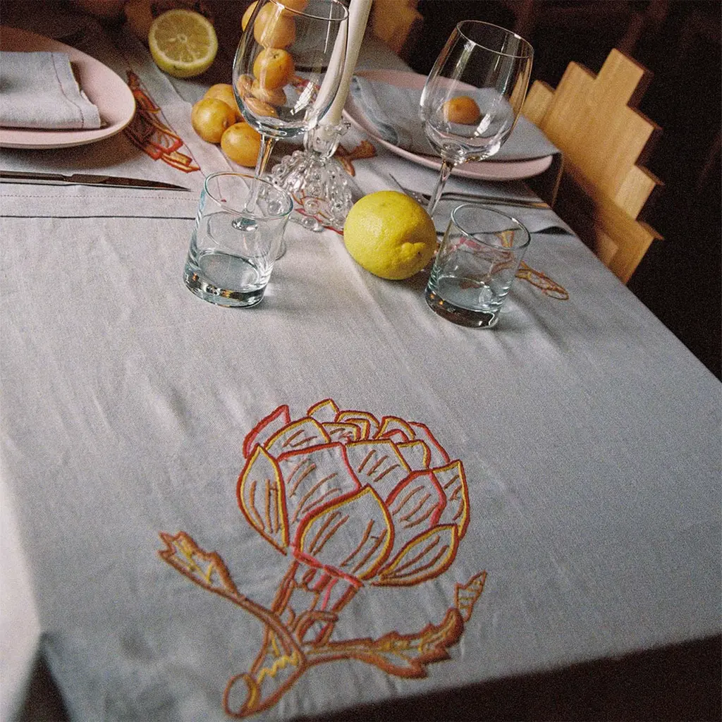 Hand-embroidered with open hems, our linen tablecloths provide the perfect backdrop for anysetting. With each motif taking fourteen hours to complete, and each meter of open hem two hours toprepare, the artistry behind each design is significant. Style with contrasting-coloured ceramics anddelicate floral arrangements for a chic, maximalist aesthetic.The striking silhouette of the artichoke has inspired this collection, with its form outlined in a delightfully embroidered motif. Celebrating the beautiful aesthetic of the delicacy, the decorative details bring a tasteful elegance to each of the four colourways.