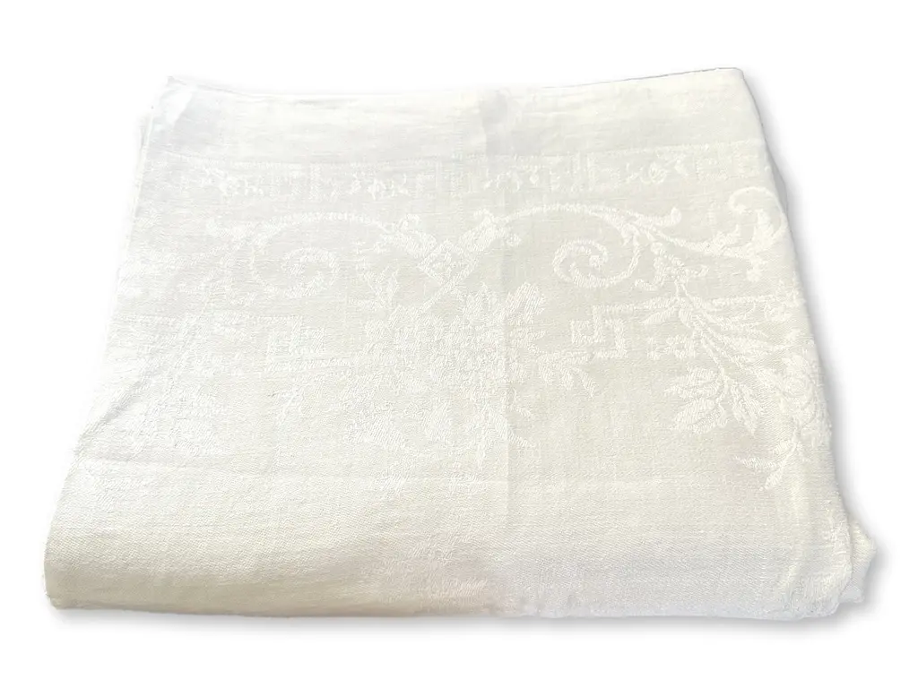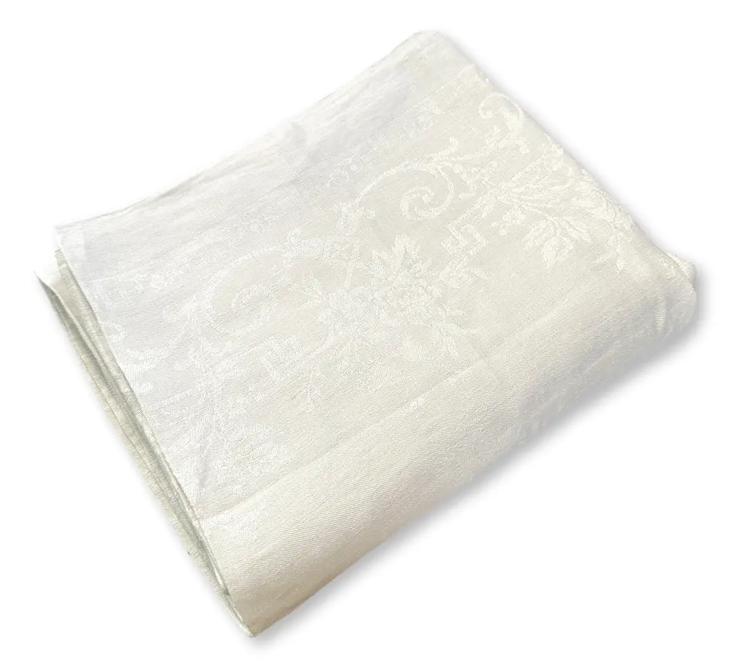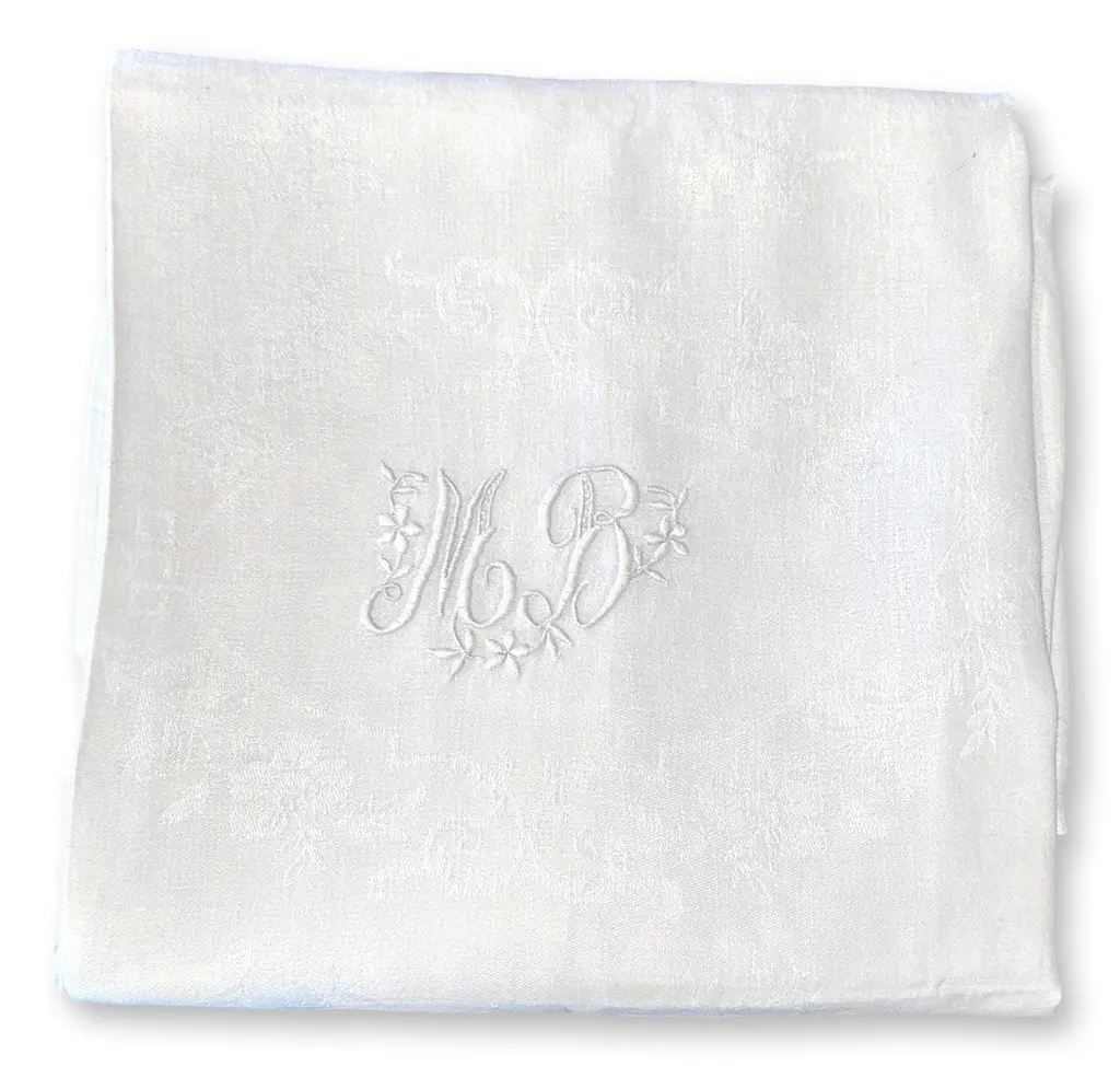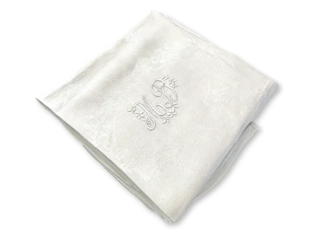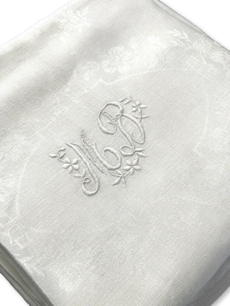 Add a touch of timeless elegance to your kitchen with this French ivory damask tablecloth. Fancy MB monogram, pattern on pattern damask. Crafted with exquisite attention to detail, it boasts the softness and durability of antique French linen. Classic design and delicate texture makes it perfect for both everyday use and special occasions. Elevate your culinary space with a piece of French heritage that combines practicality with sophistication