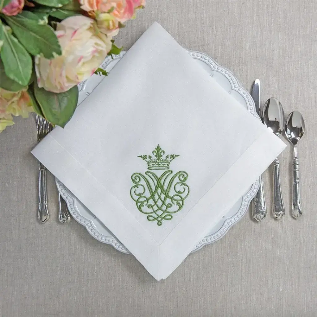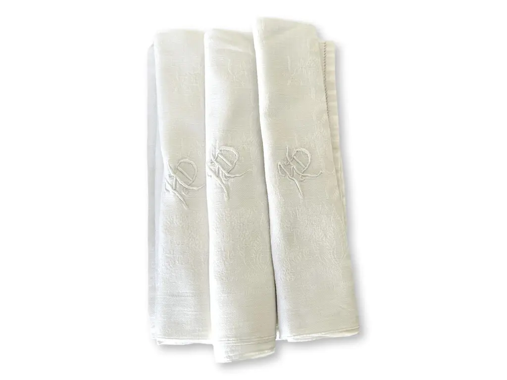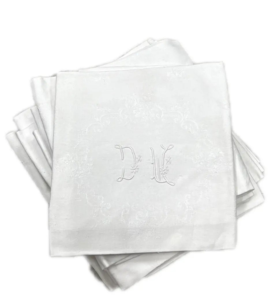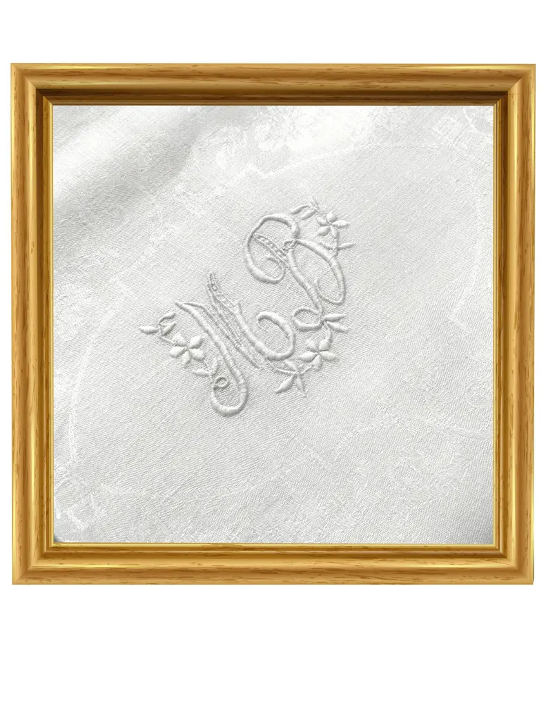 Add a touch of timeless elegance to your kitchen with this French ivory damask tablecloth. Fancy MB monogram, pattern on pattern damask. Crafted with exquisite attention to detail, it boasts the softness and durability of antique French linen. Classic design and delicate texture makes it perfect for both everyday use and special occasions. Elevate your culinary space with a piece of French heritage that combines practicality with sophistication