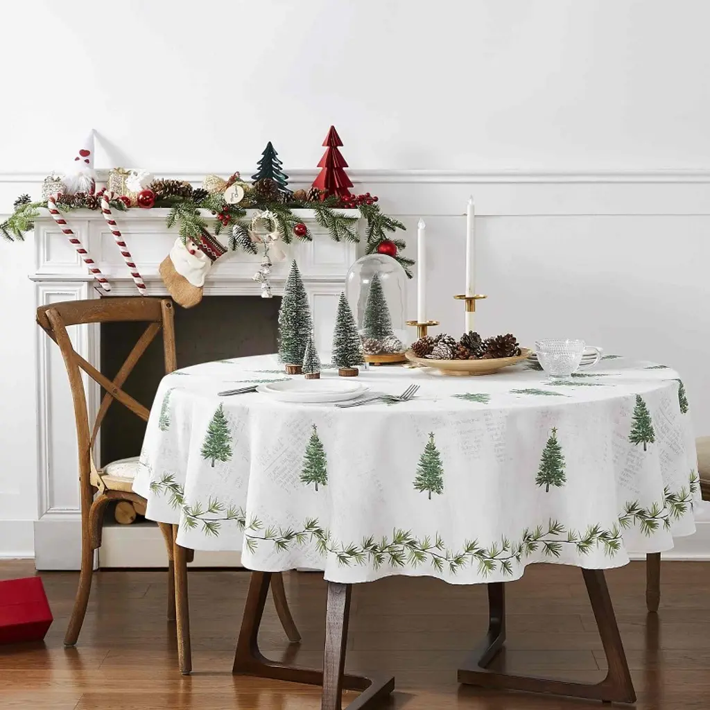 The Avanti Trees 70" Round Holiday Tablecloth features a festive design with 2 opposing pine trees in the center and a full border of trees with pine branches. The ground is off-white and linen with grey highlights throughout. Printed on 100% polyester for easy care and brilliant color.