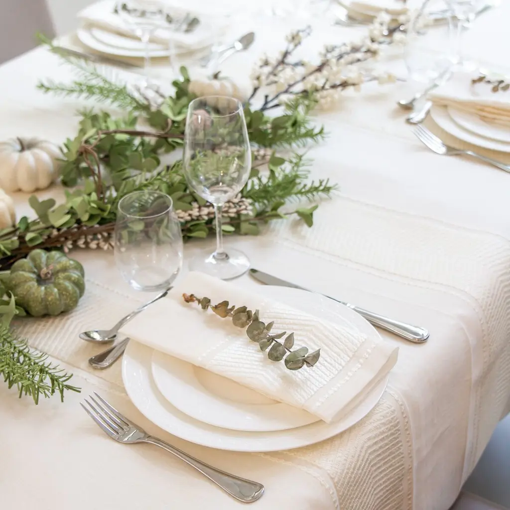 Bands of geometric stitching bring subtle pattern and texture to this snow-white tablecloth. Not only is it the ultimate in elegance, but it's also conveniently machine-washable. We sell matching napkins and a table runner as well.