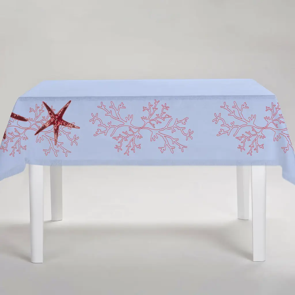 Evocative of marvelous underwater scenarios, this fringed tablecloth in Masters of Linen-certified linen makes for the ideal solution for setting an elegant table with a marine view. Minute embroideries of coral and starfish in fine pink Mako cotton decorate the weft, which is further embellished with color-coordinated spangles for a stylish twist. More color options are available.