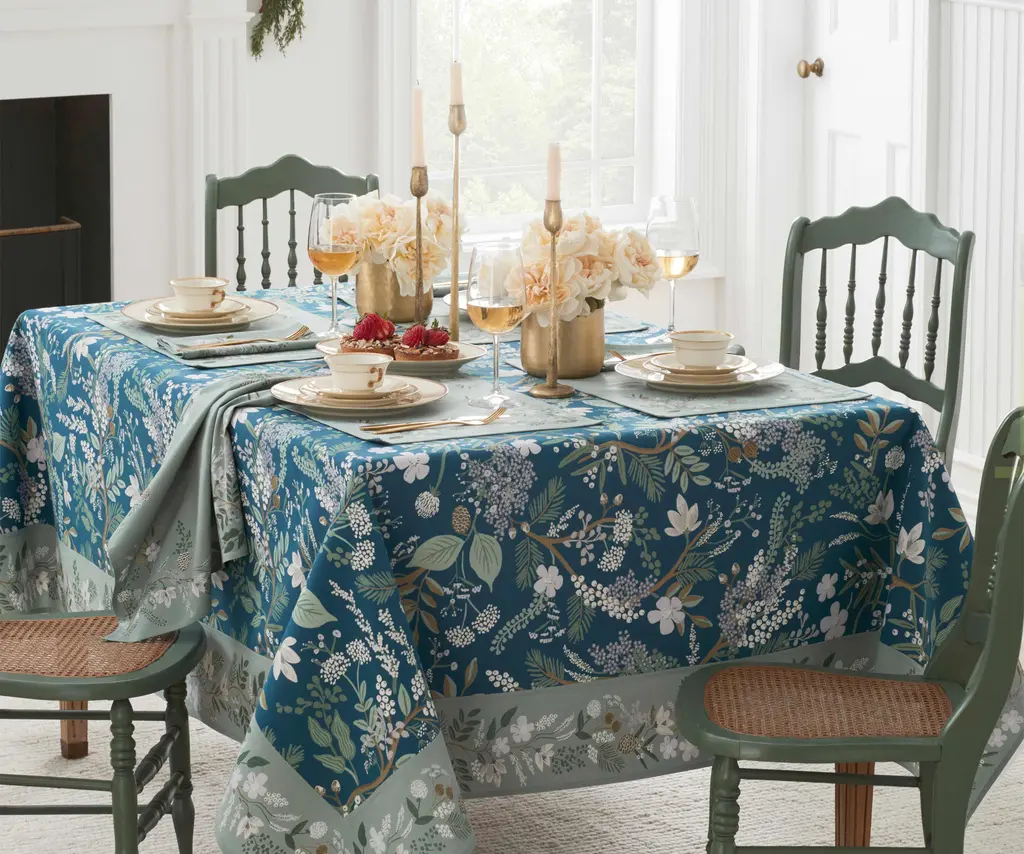 Set your table with our Juniper Forest tablecloth, featuring a layered, woodsy design of berries, hanging moss, and pinecones tucked into rambling stems and branches. Our 100% cotton table linens are available in three sizes, and designed to layer with Juniper Forest our cotton napkins. Part of the Rifle Paper Co. x The Company Store collection.