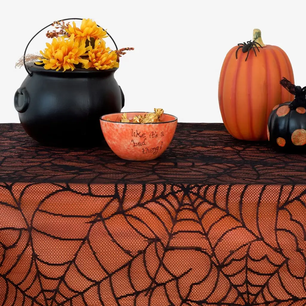 Crawling Halloween Spider Lace Lined Tablecloth - 60" X 84" - Black/orange - Elrene Home Fashions