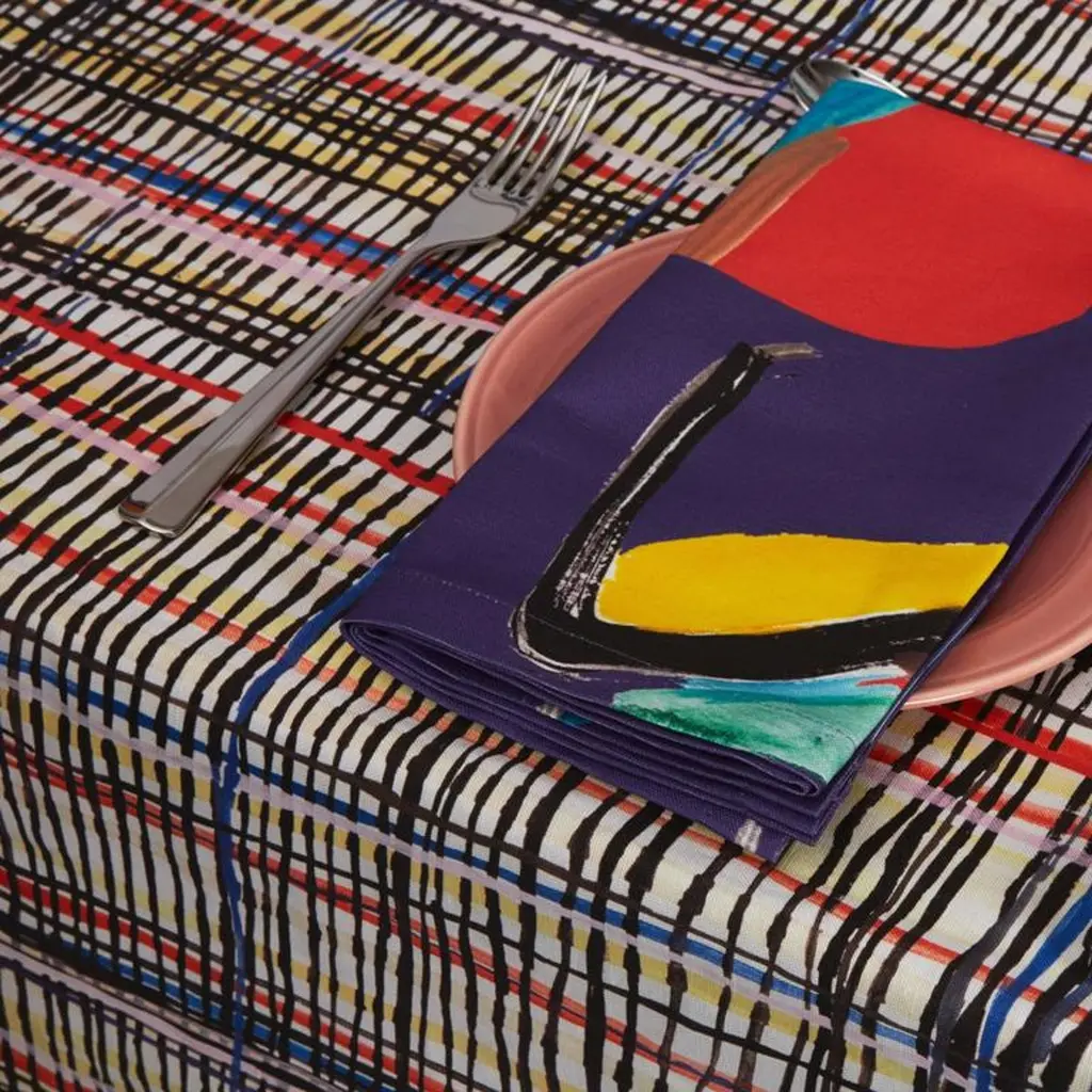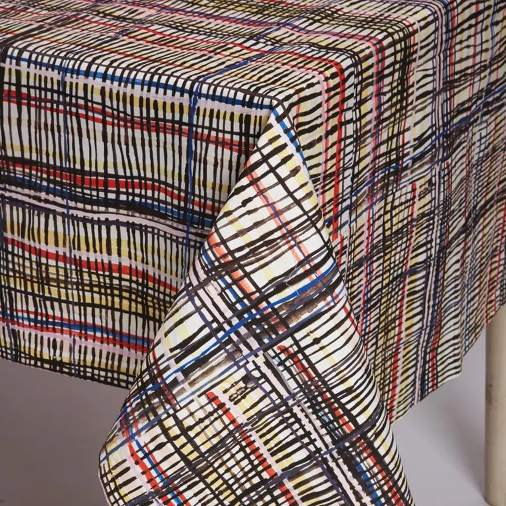 Infuse vivacious art into your home with the crazy plaid tablecloth. This digitally printed linen cotton canvas tablecloth is made from an original watercolor painting by Naomi Clark. Care instructions: Machine wash cold, line dry.