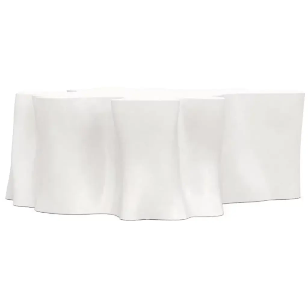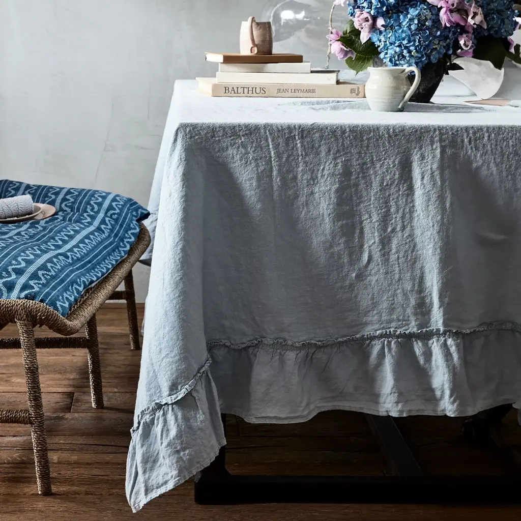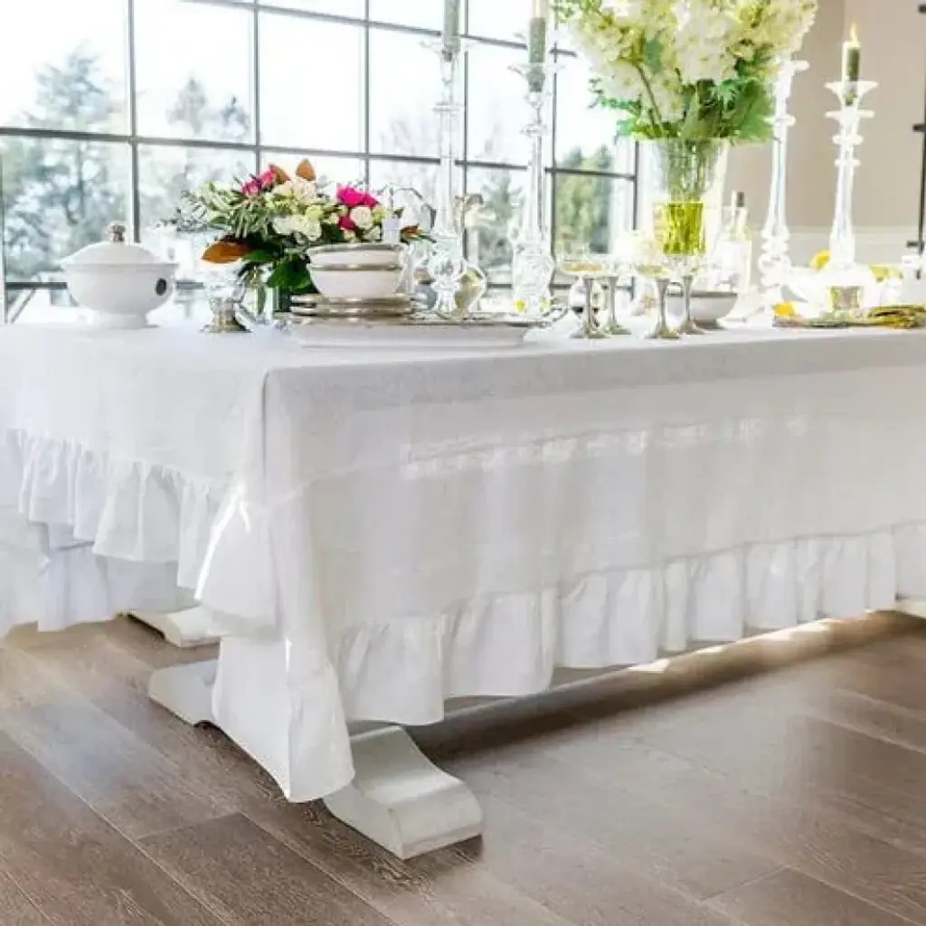 What a wonderful way to dress up your table with a 100% European linen round tablecloth. Combine it with our embroidered napkins for a beautiful and elegant table. Machine wash, lay flat to dry and easy iron for best look. Tablecloth is 90" round, including the large ruffle.