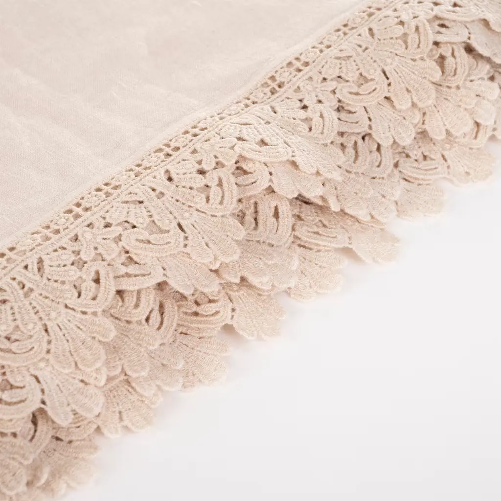 This cream linen tablecloth features an exquisite embroidered edging with romantic Sicilian lace, adding a sophisticated artisanal touch to your dining experience. Perfect for both formal and casual settings, it brings elegance and charm to any table. A timeless piece that elevates your table decor with a refined finish. Available in various sizes and a wide range of colors, please ask the concierge for other details.