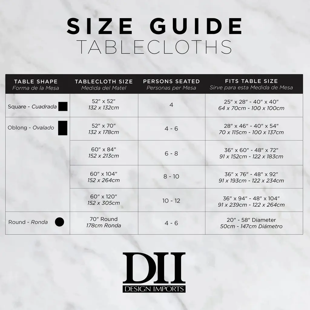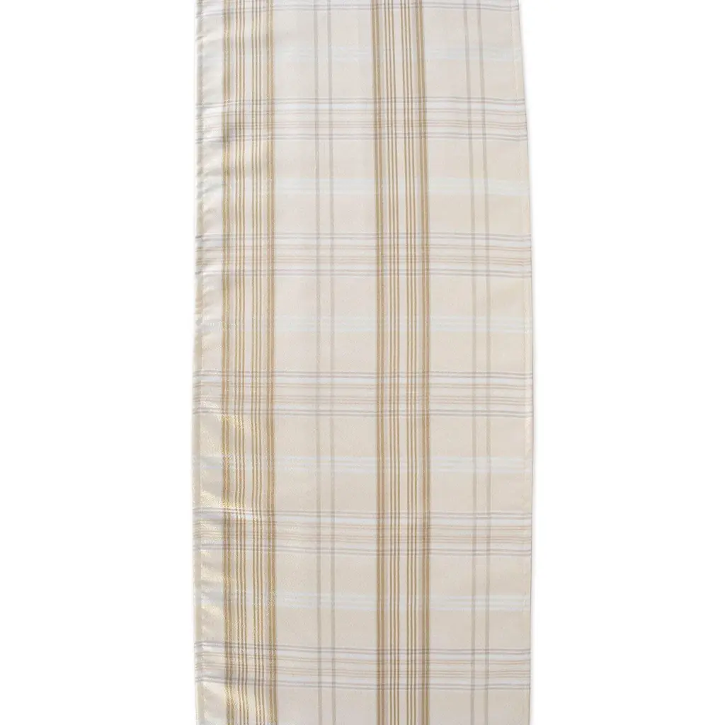 DII has a wonderful selection of holiday and everyday table top items available. Our metallic Cream Plaid Table Runner is 85% Polyester and 15% metallic fibers with a whimsical holiday design to add flair to your table. The 60x120" Size is long enough for most surfaces, appropriate for a table that can seat 8-10 people. To minimize shrinkage, please follow care instructions. Find DII full selection of table runner and tablecloths by searching for "DII Cotton Tablecloths Table Runner" or search "DII For the Home".